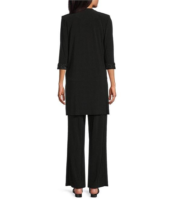 From Le Bos, this pant set features: Jacket: knit & embroidery fabrication duster cardigan silhouette open front neckline with embroidery trim 3/4 sleeves with embroidery at cuffs knee length open front; no closure approx. 35.5" length polyester/spandex; embroidery: polyester machine wash cold/tumble dry low Top: knit & embroidery fabrication round neckline with embroidery trim sleeveless pullover construction approx. 25.5" length polyester/spandex; embroidery: polyester machine wash cold/tumble dry low Pants: knit fabrication straight leg silhouette elastic waist pull-on construction approx. 29.5" inseam polyester/spandex machine wash cold/tumble dry low Imported.