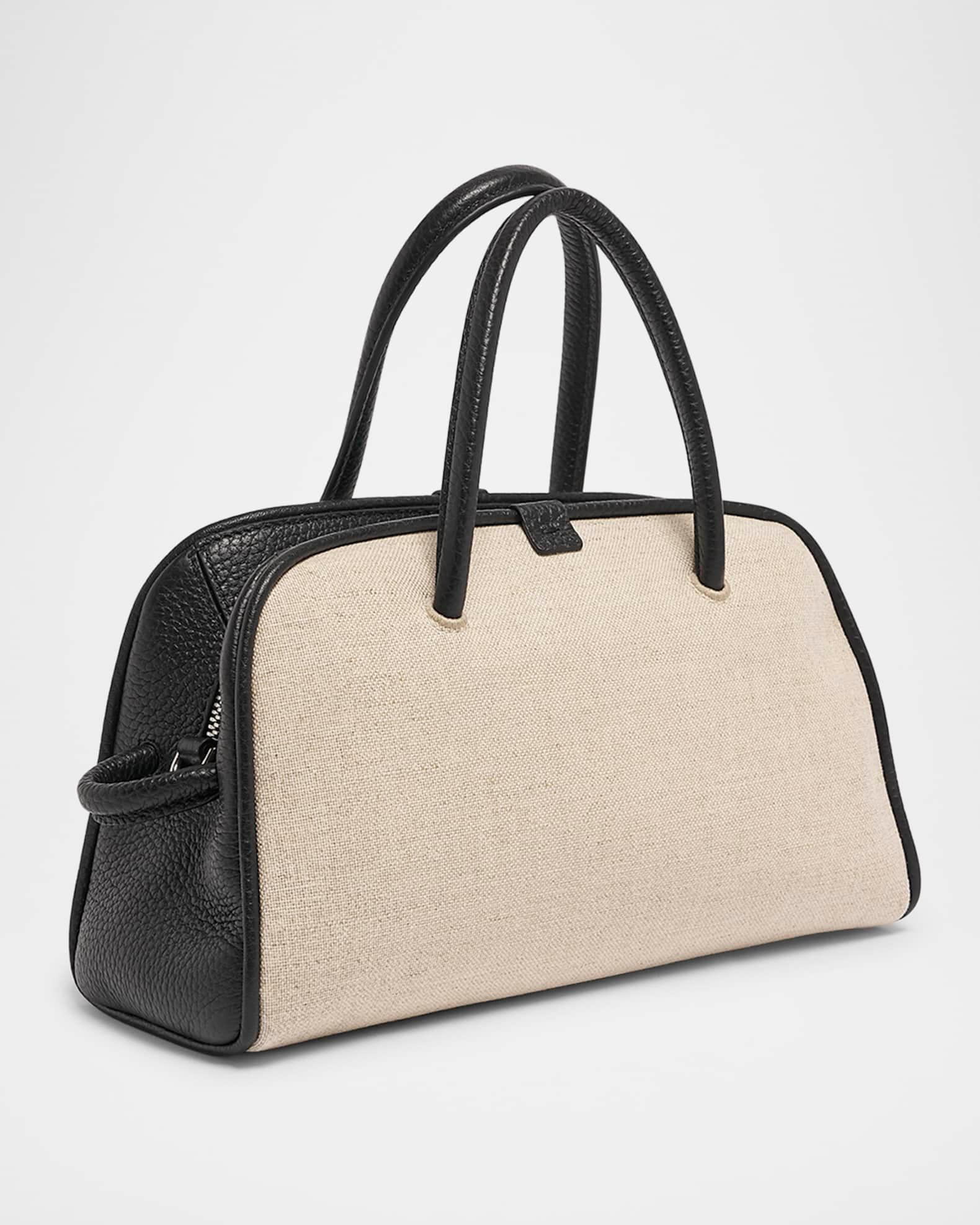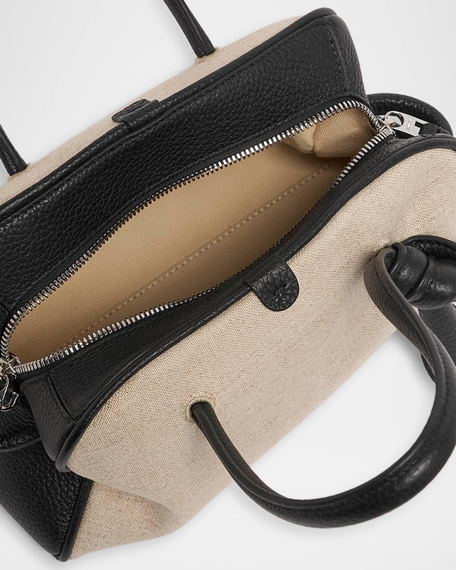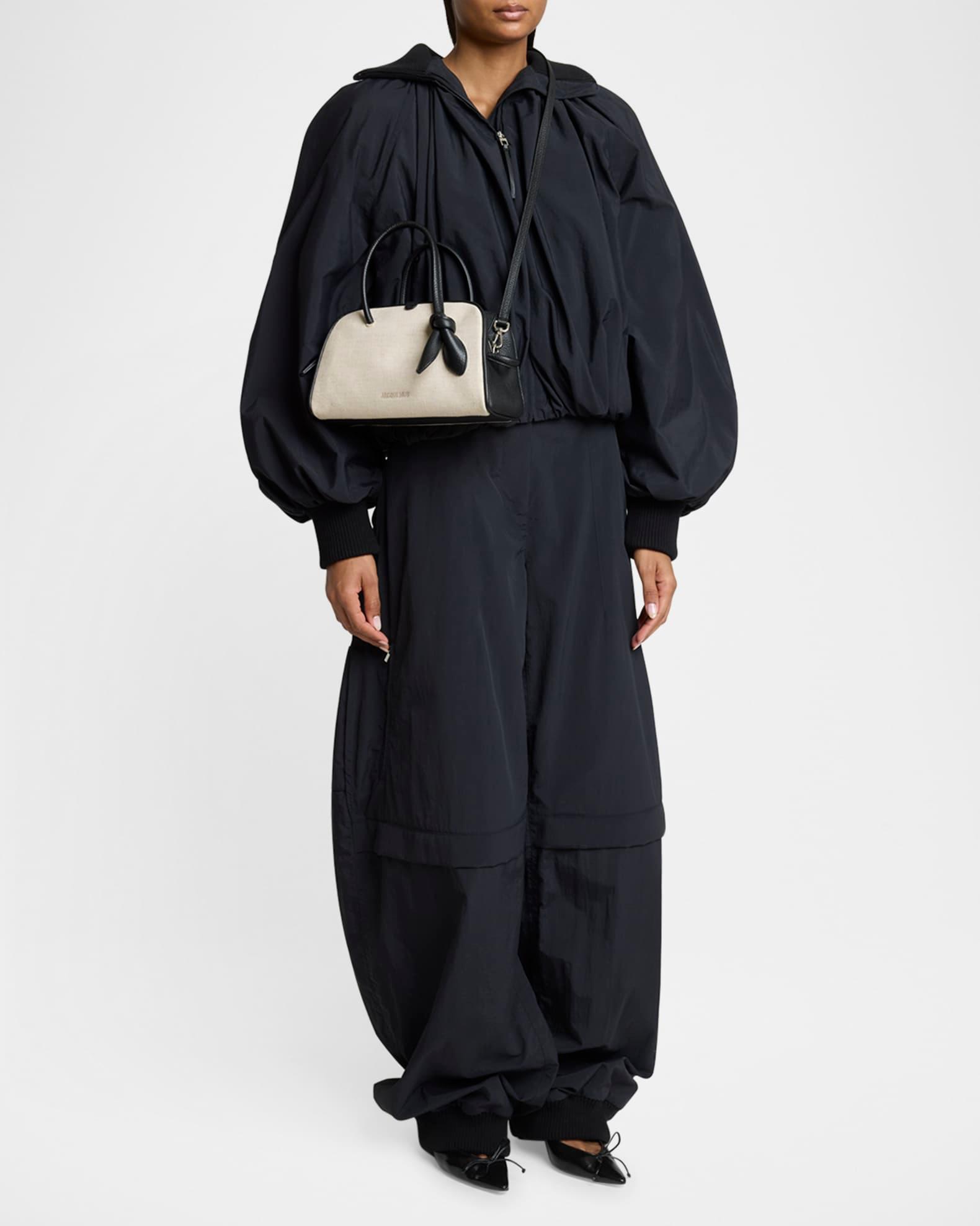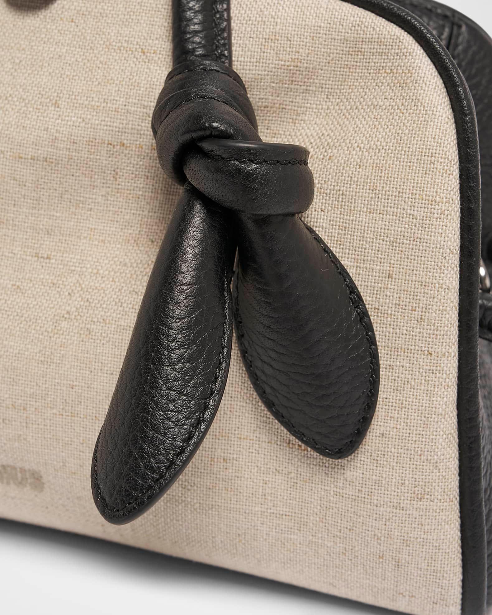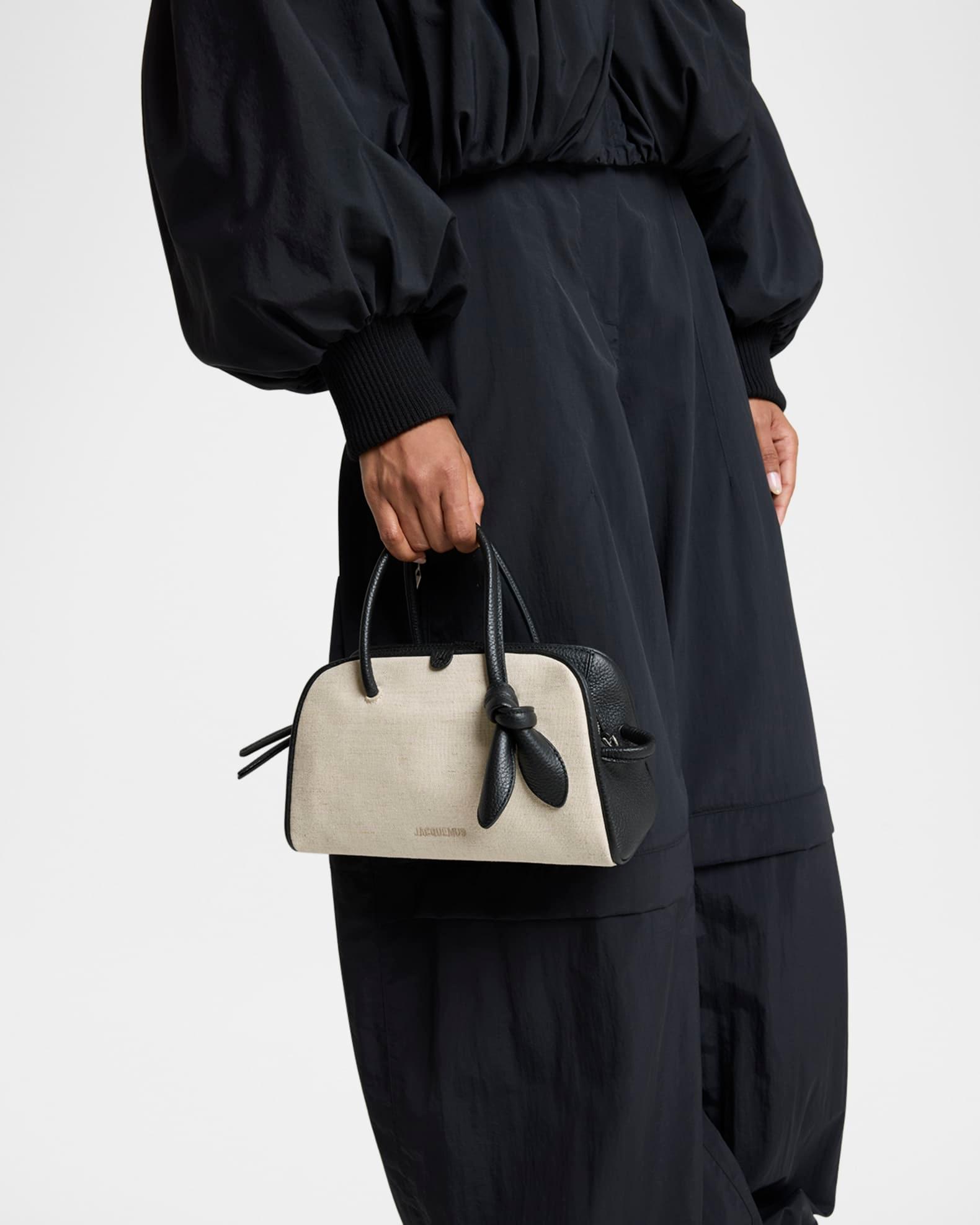 Jacquemus "Le Petit Turismo" top handle bowling bag in grained calf leather and linen Features embroidered logo text on the front Rolled top handles with bow detail Detachable, adjustable shoulder strap Interior, one zip pocket Two-way zip top with magnetic closure Cotton lining Approx. 10.2"W x 6.3"H x 4.3"D Made in Italy
