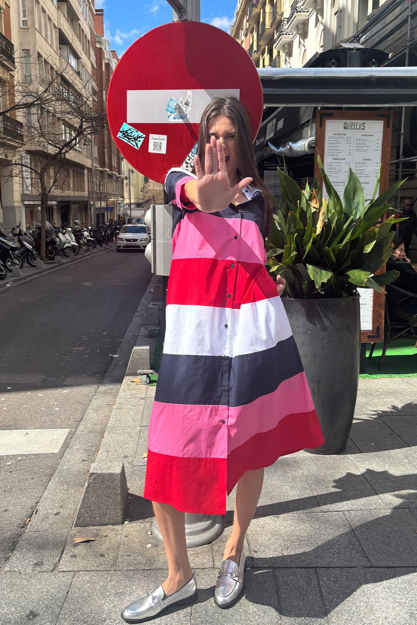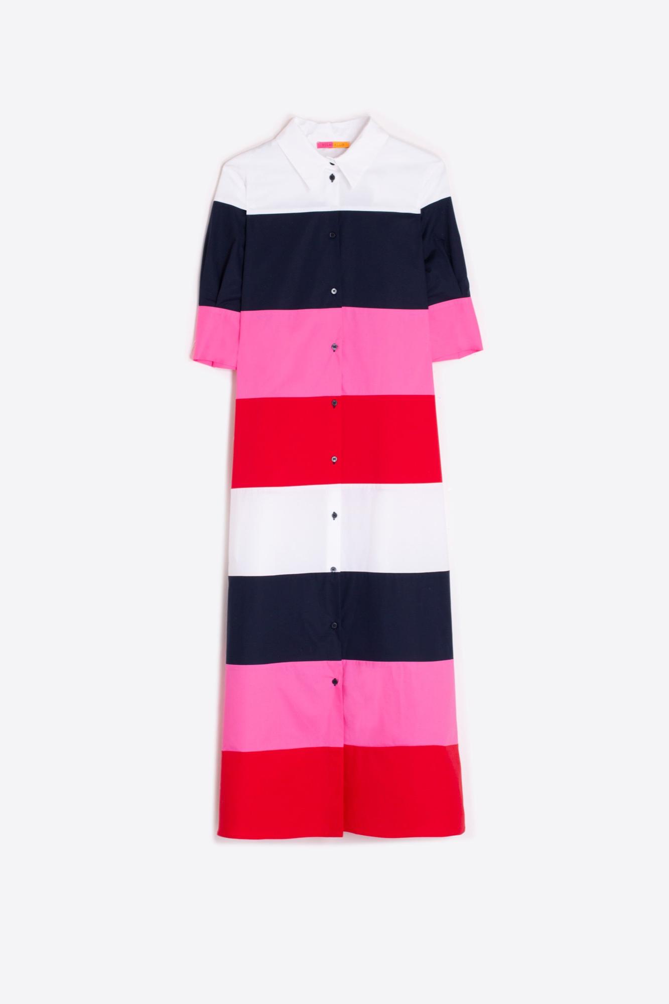 Midi shirt dress with horizontal stripes in white, navy blue, pink and red. Front closure with shirt buttons. Shirt collar. Short sleeve. 95%COTTON 5%ELASTANE
