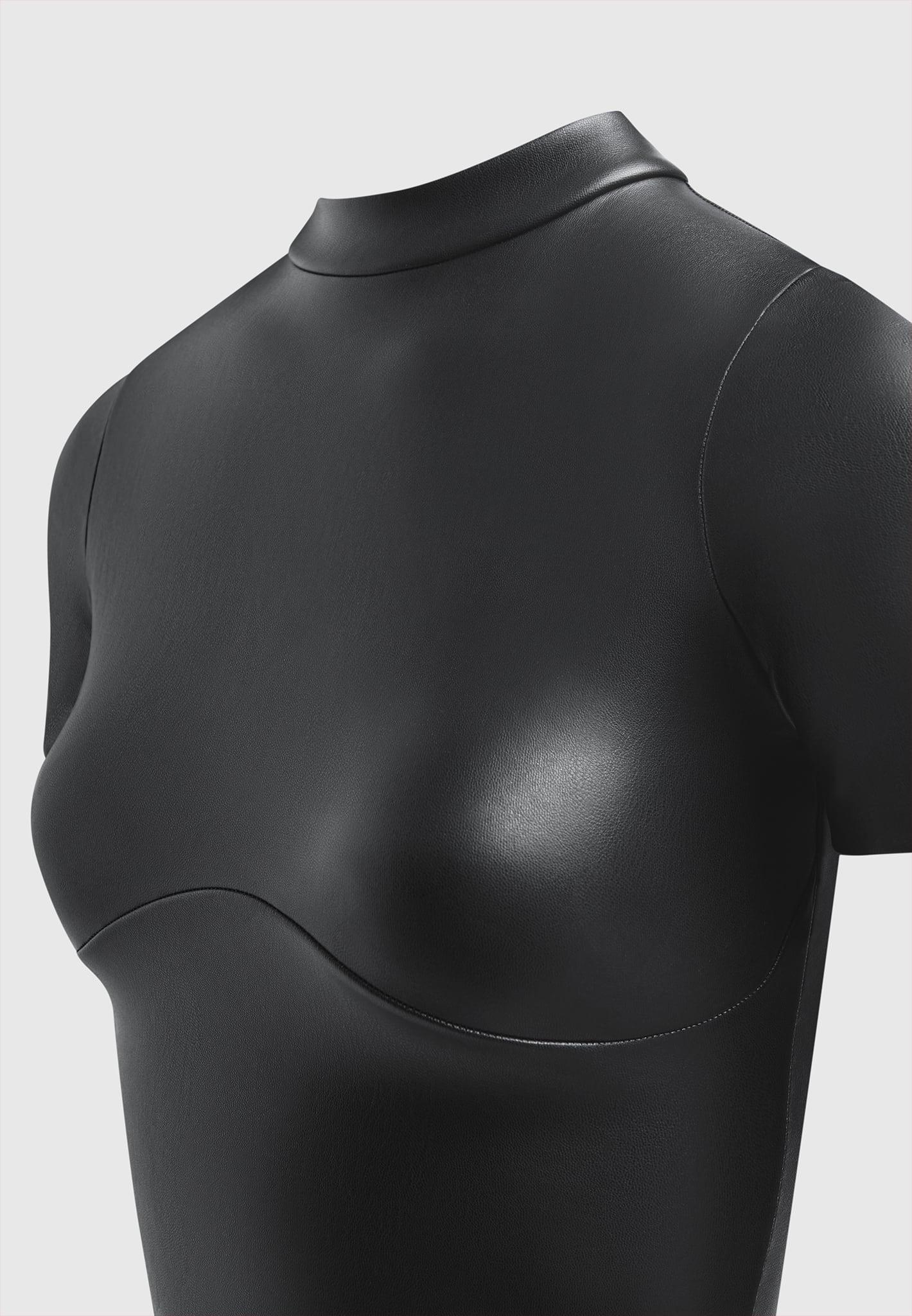 This vegan leather bodysuit is designed to accentuate your form with its classic design and contour bust detailing. The black colour and mesh gloves provide a sophisticated and alluring look that you can wear with confidence. Perfect for a night out or your next special event. High Neck Bodysuit Silhouette Contour Bust Detailing Concealed Zip Closure Detached Mesh Gloves Short Sleeve Silver Manière De Voir Eiffel Plaque 55% PU 40% Polyester 5% Elastane / 89% Polyester, 11% ElastaneAlways check the care label for wash instructions.