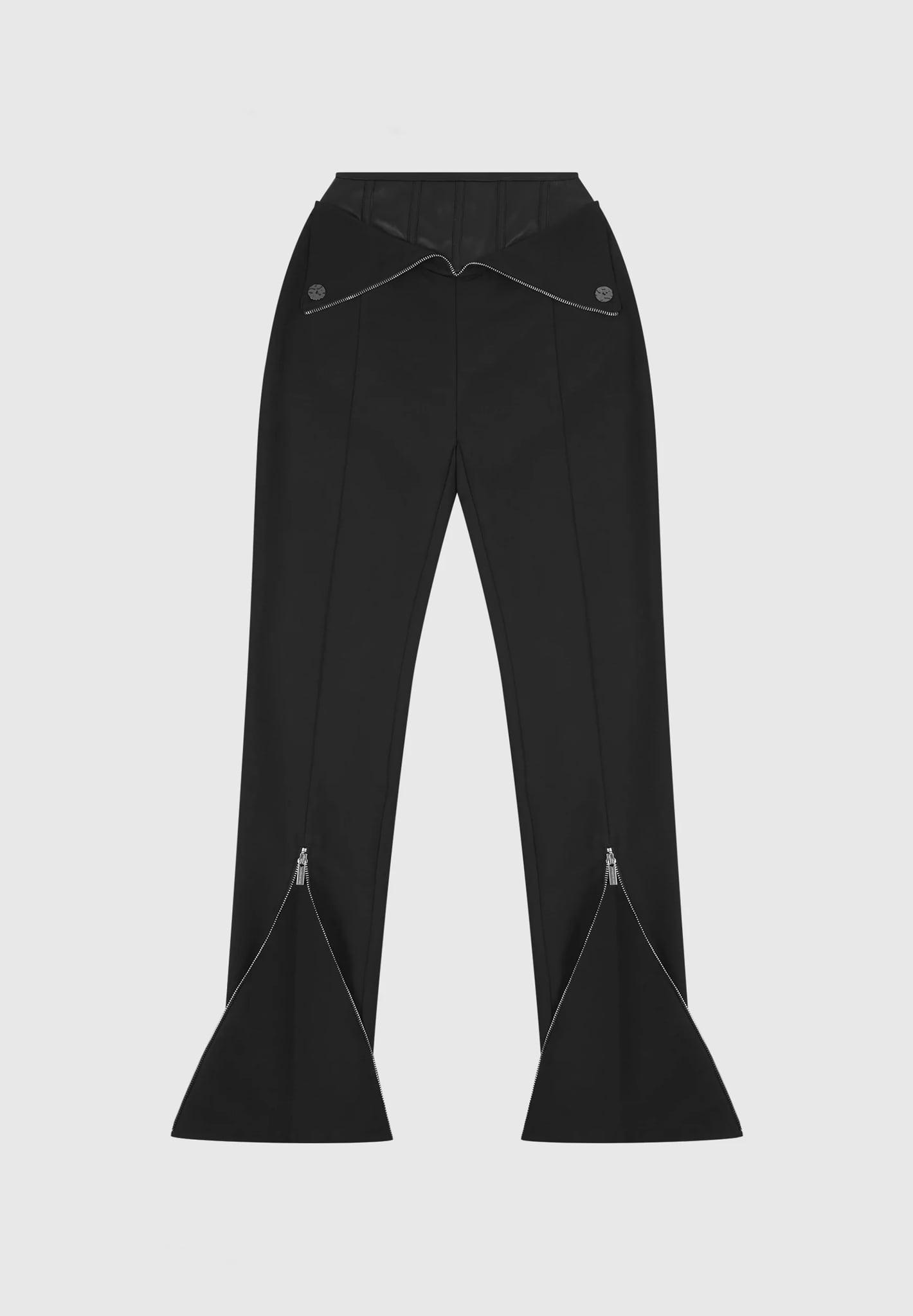 These trousers feature functioning zips at centre front at the hem, unveil additional material to create flared trousers that effortlessly drapes over heels giving the illusion of elongated legs. Tailored Trousers Silhouette Vegan Leather Corset Silver Hammered Buttons Silver Zip at Hem Full Length Pleat Silver Manière De Voir Plaque 55% Polyester, 45% PU / 95% Polyester, 5% ElastaneAlways check the care label for wash instructions.