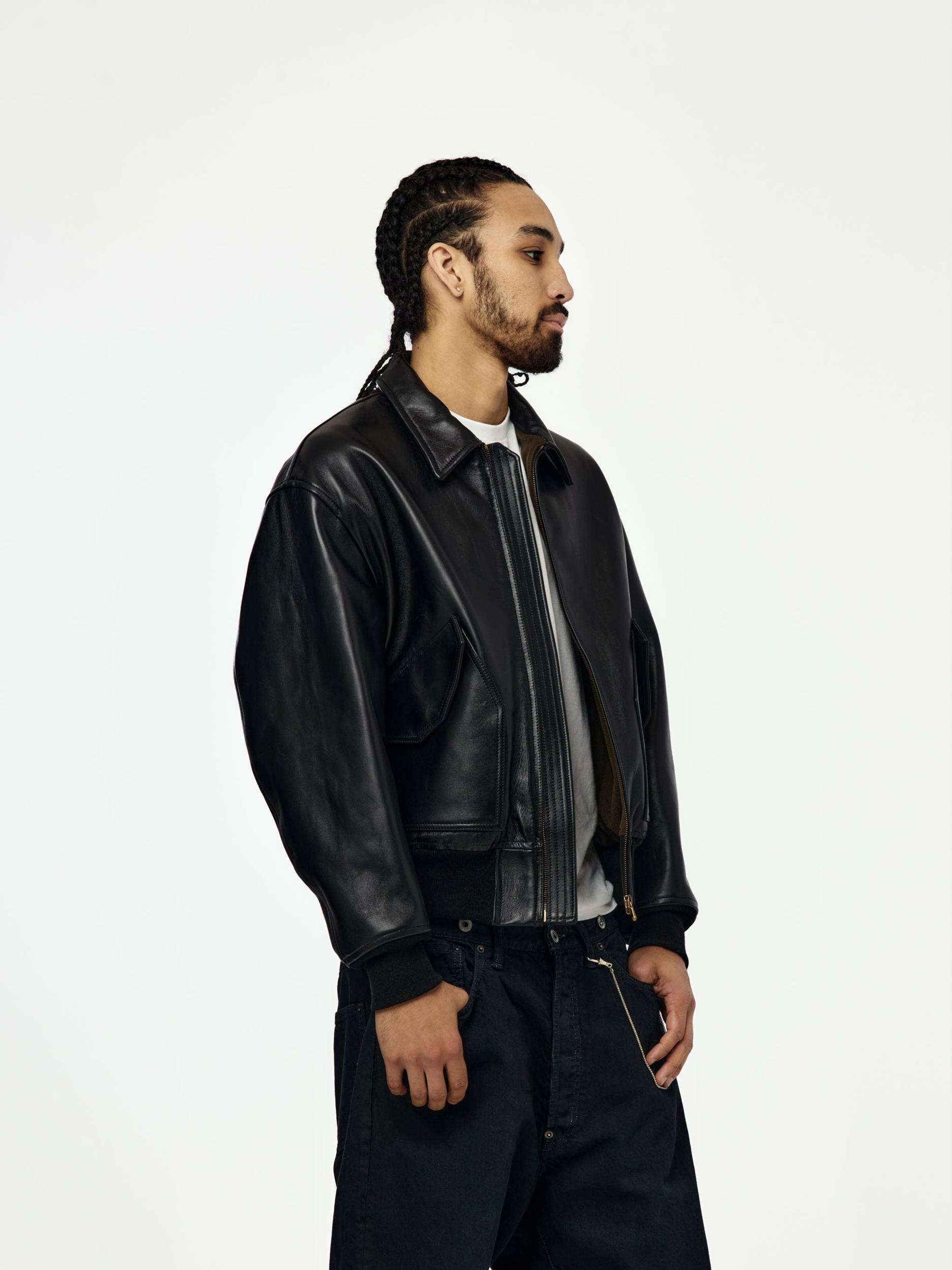 The A.PRESSE Leather CWU-45 Flight Jacket elevates a military aviation classic through premium leather and precise construction. Finished in Black, the jacket maintains its original utility while introducing a refined hand feel and modern proportion. A statement outerwear piece rooted in heritage and craft. SKU: 26SAP-01-03