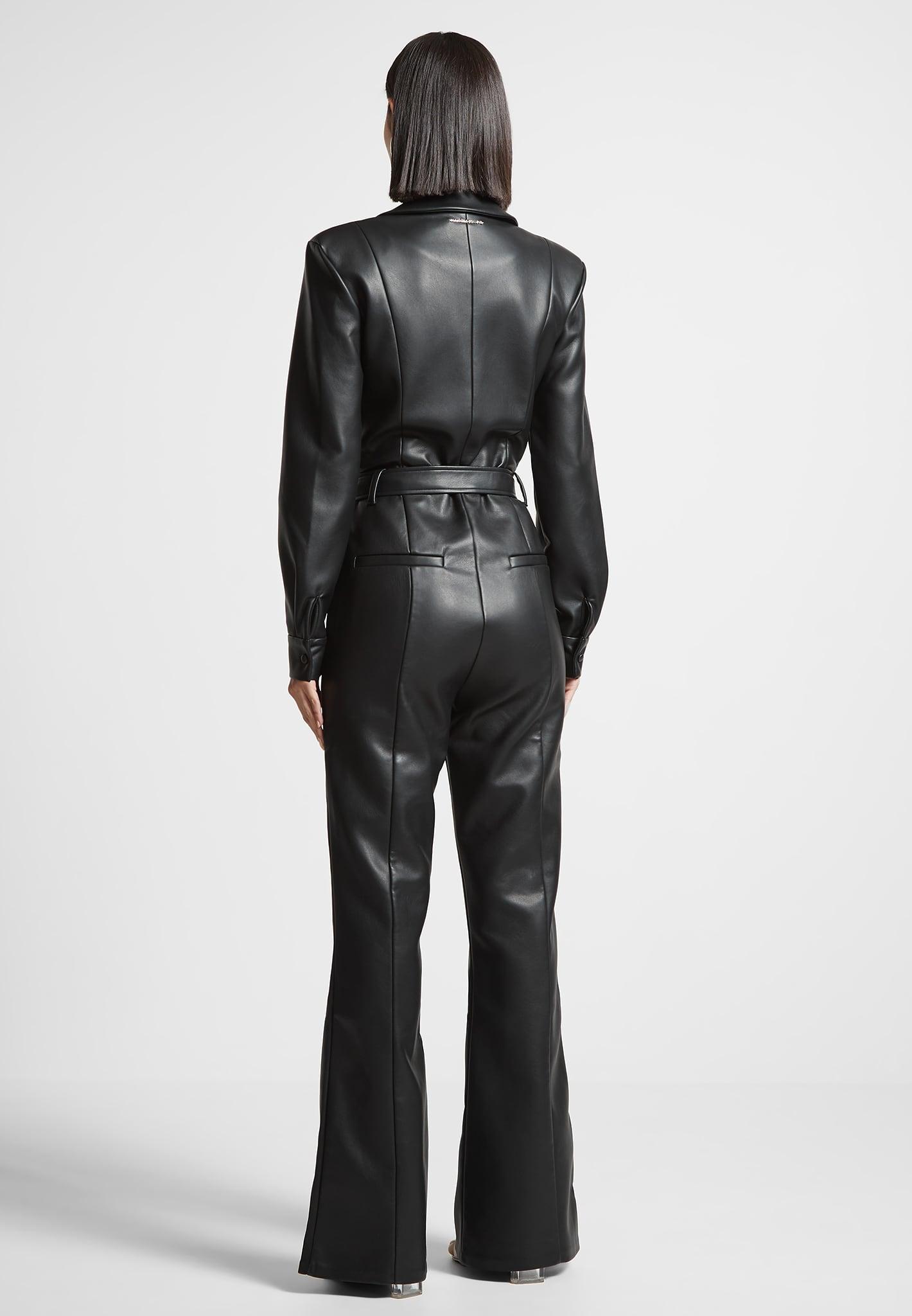 This stylish jumpsuit offers a tailored fit and flare leg silhouette to give you an effortlessly chic look. Made with vegan leather, you’ll look fabulous while still being conscious of your fashion choices. Fabric: Always check the care label for wash instructions. Model is 5'8", 32.5" Bust, 24" Waist, 32" High Hip, 37.5" Low Hip and Wears UK Size 6 Based on UK Size 6 - Front Length cm/in, Chest cm/in, Sleeve Length cm/in Stretch Factor - /3
