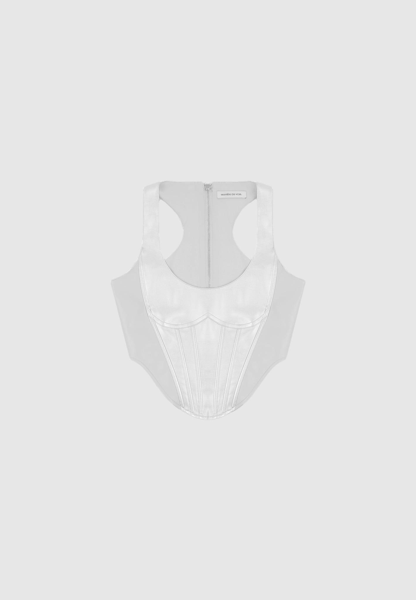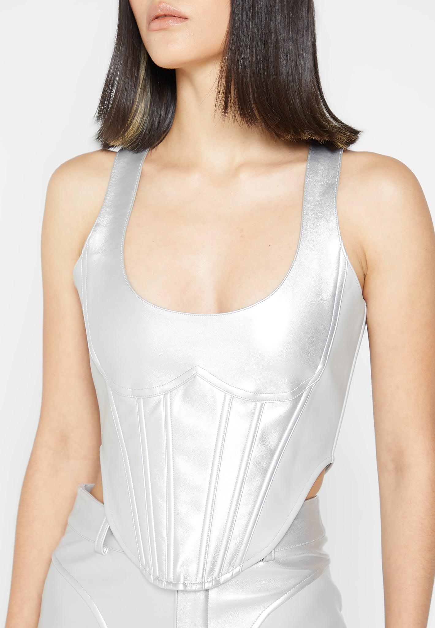 All eyes will be on you with this vegan leather metallic set. The slim fit combined with the contrast panelling creates a high fashion look desirable for any occasion. Corset Top Silhouette Vegan Leather Fabric Contrast Panelling Scoop Neck Undercuts Contouring Central Boning Silver Manière De Voir Branded Hardware 55% Polyester, 45% PU / 97% Polyester, 3% ElastaneAlways check the care label for wash instructions.