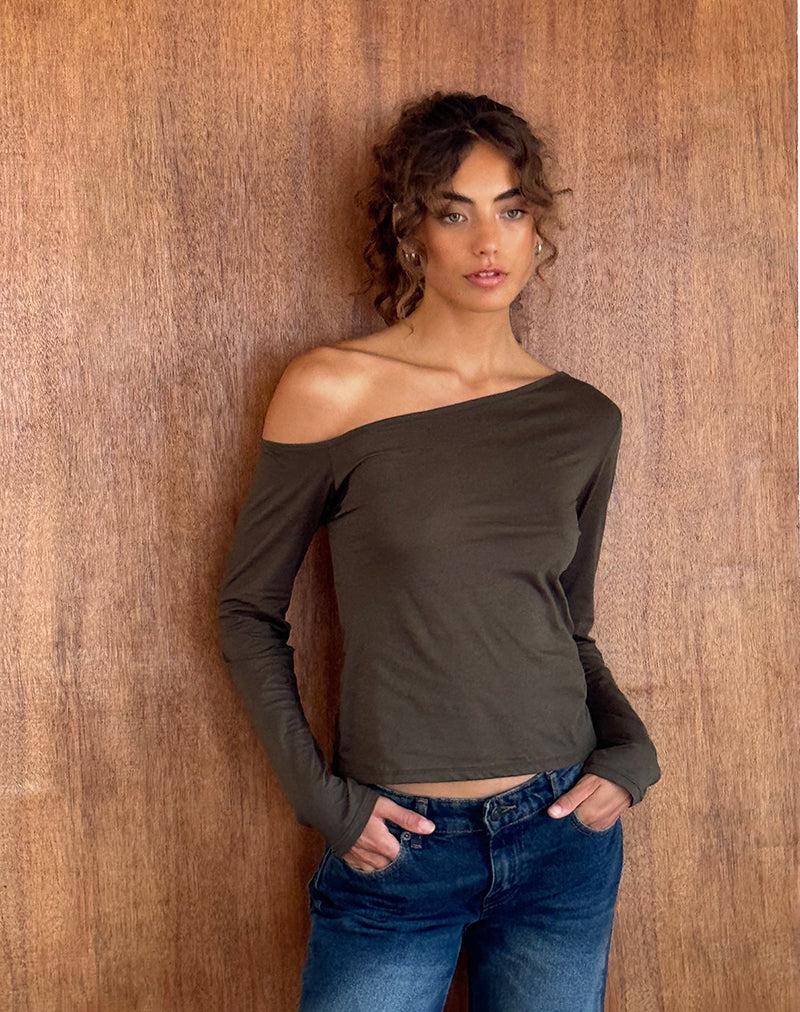 The Ledez top, in an olive tissue hue, features an asymmetrical neckline with long sleeves and slouchy fit. Get the look with our Rigid jean. MODEL WEARS SIZE: EXTRA SMALL - MODEL HEIGHT:5'6