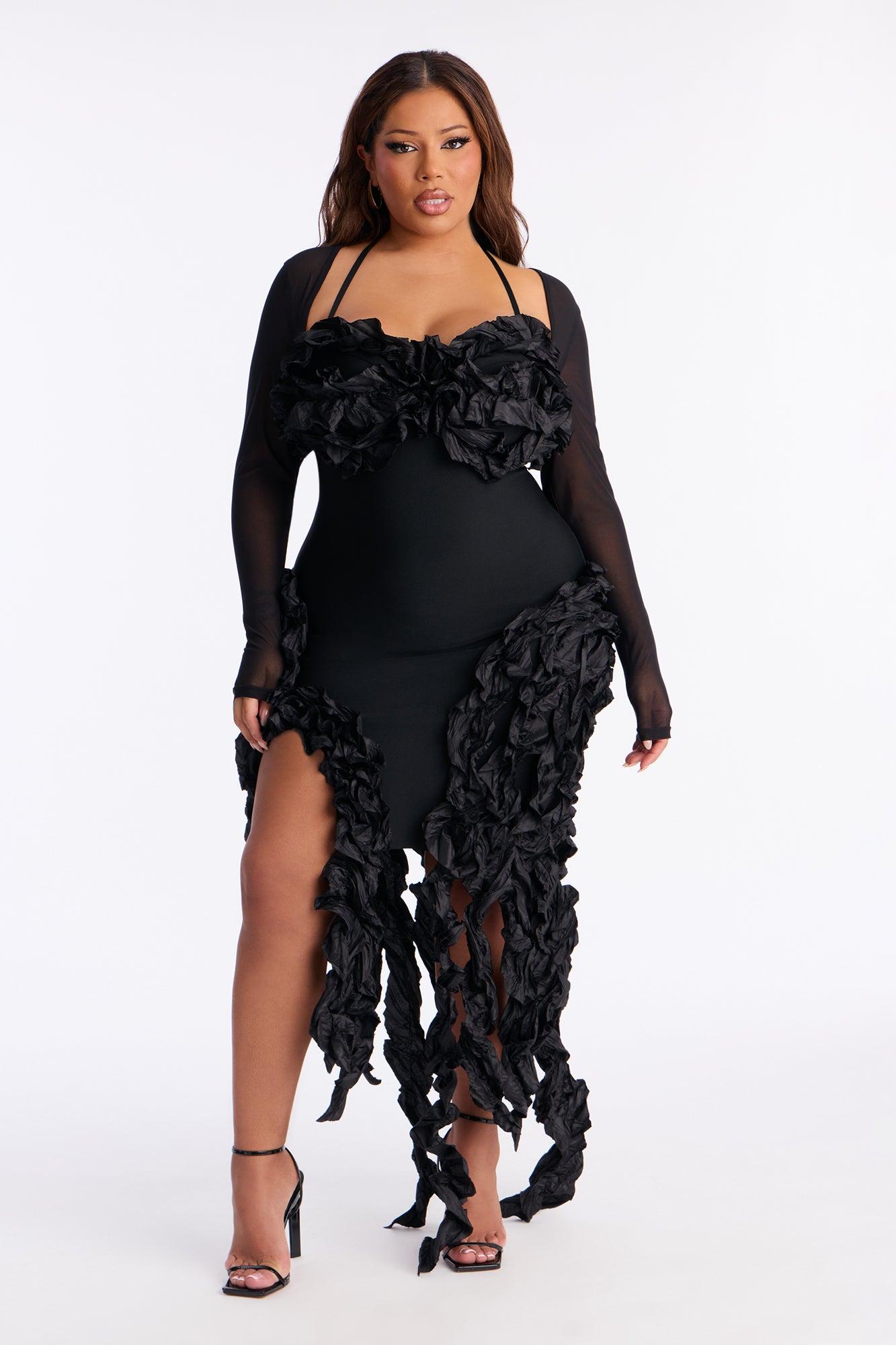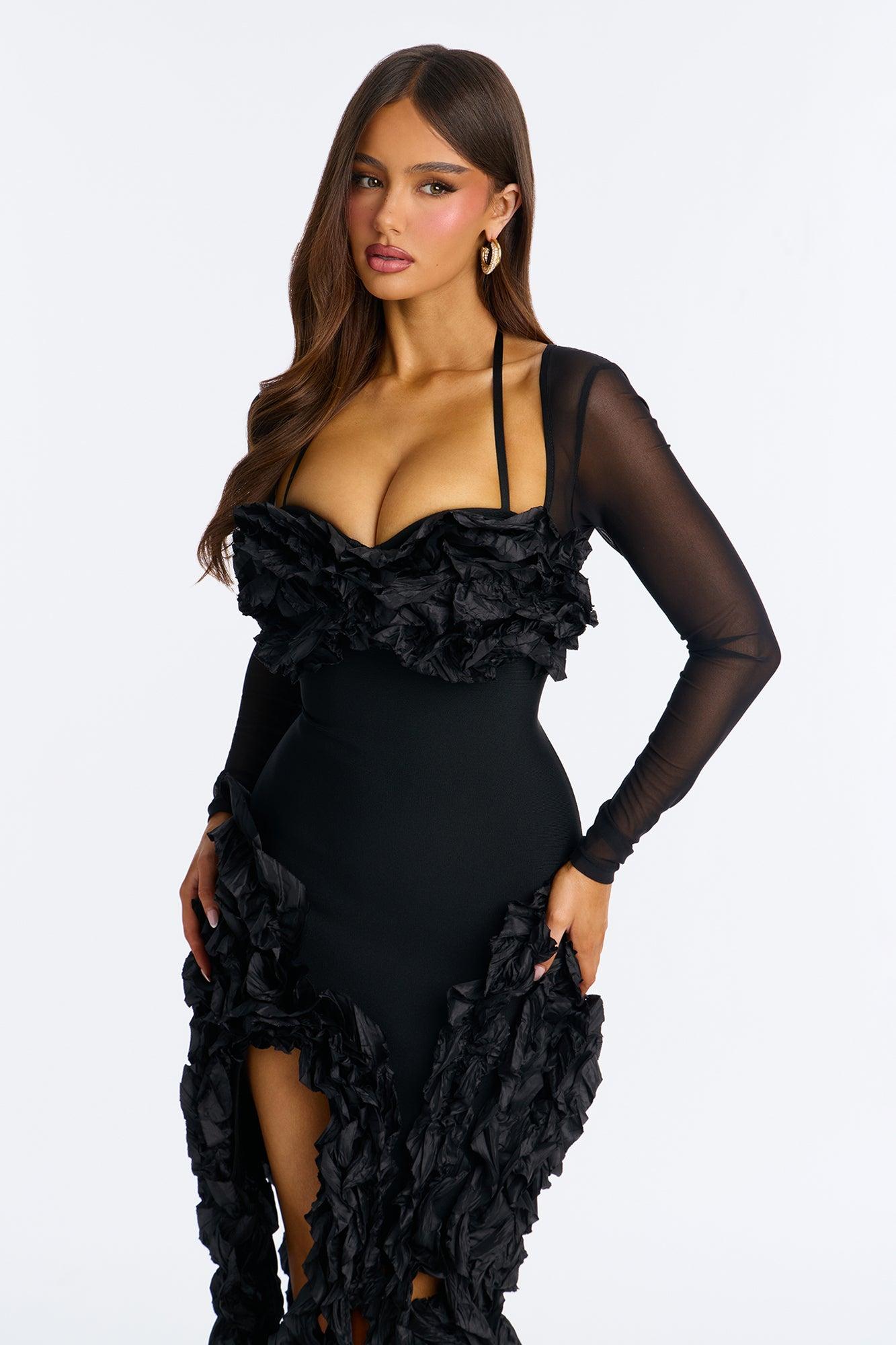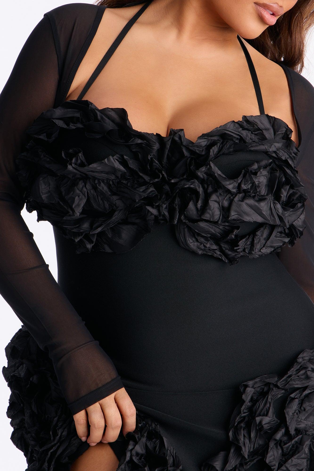 Available In Black. Bandage Mini Dress Sweetheart Neckline Long Sleeve Ruffle Hidden Back Zipper Stretch Length Measured Flat = 32" Self: 95% Polyester 5% Spandex Contrast1: 90% Polyester 10% Spandex Contrast2: 100% Polyester Lining: 100% Polyester Imported