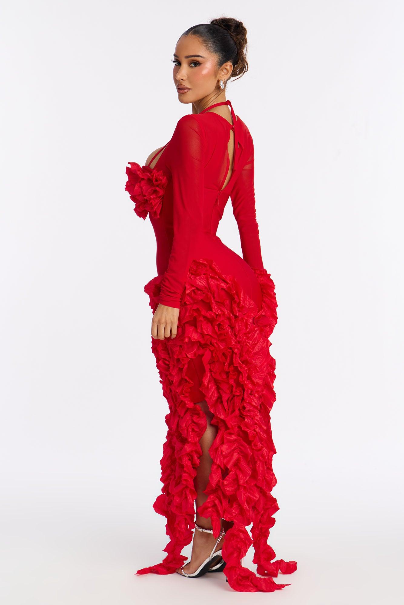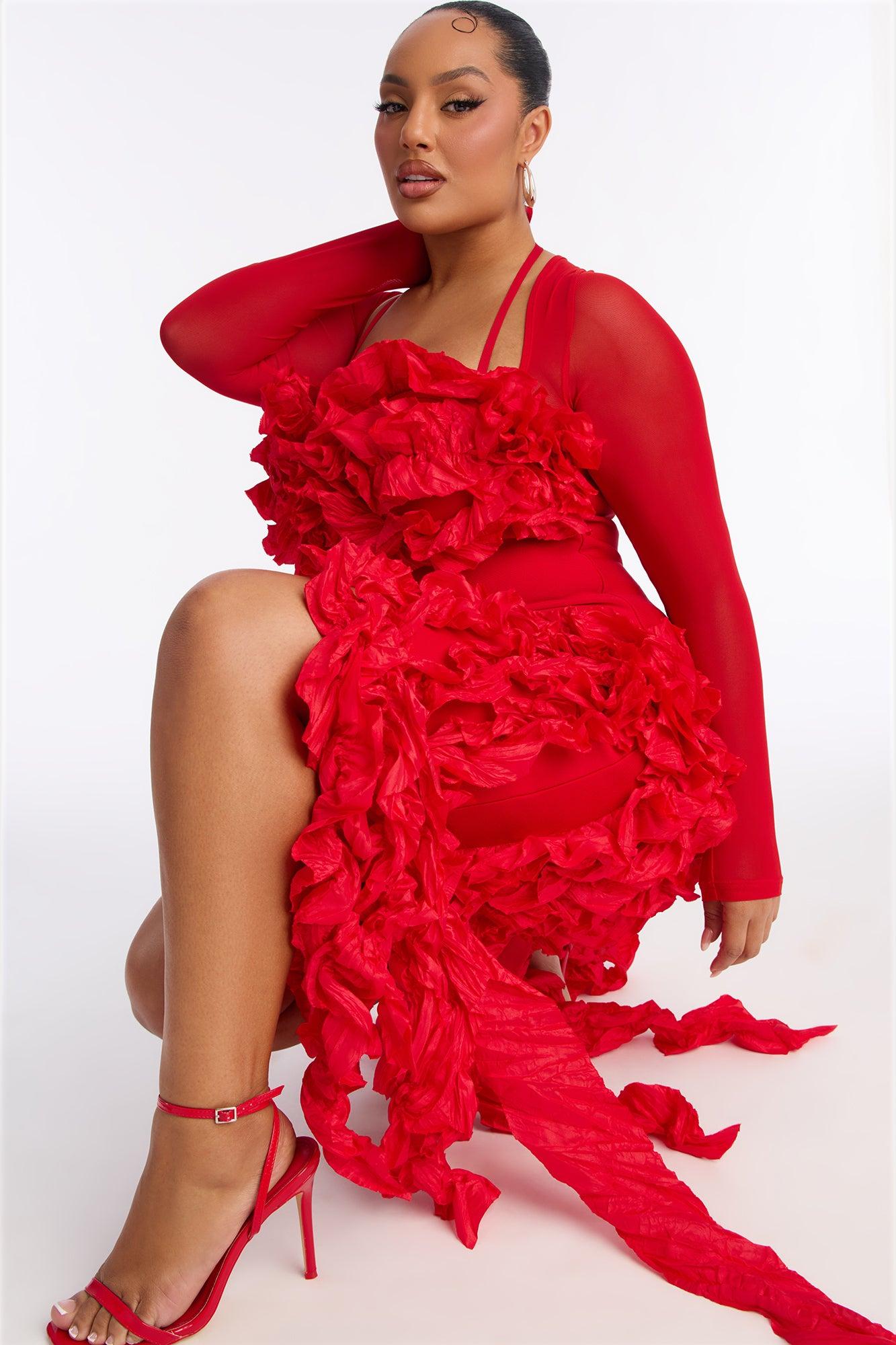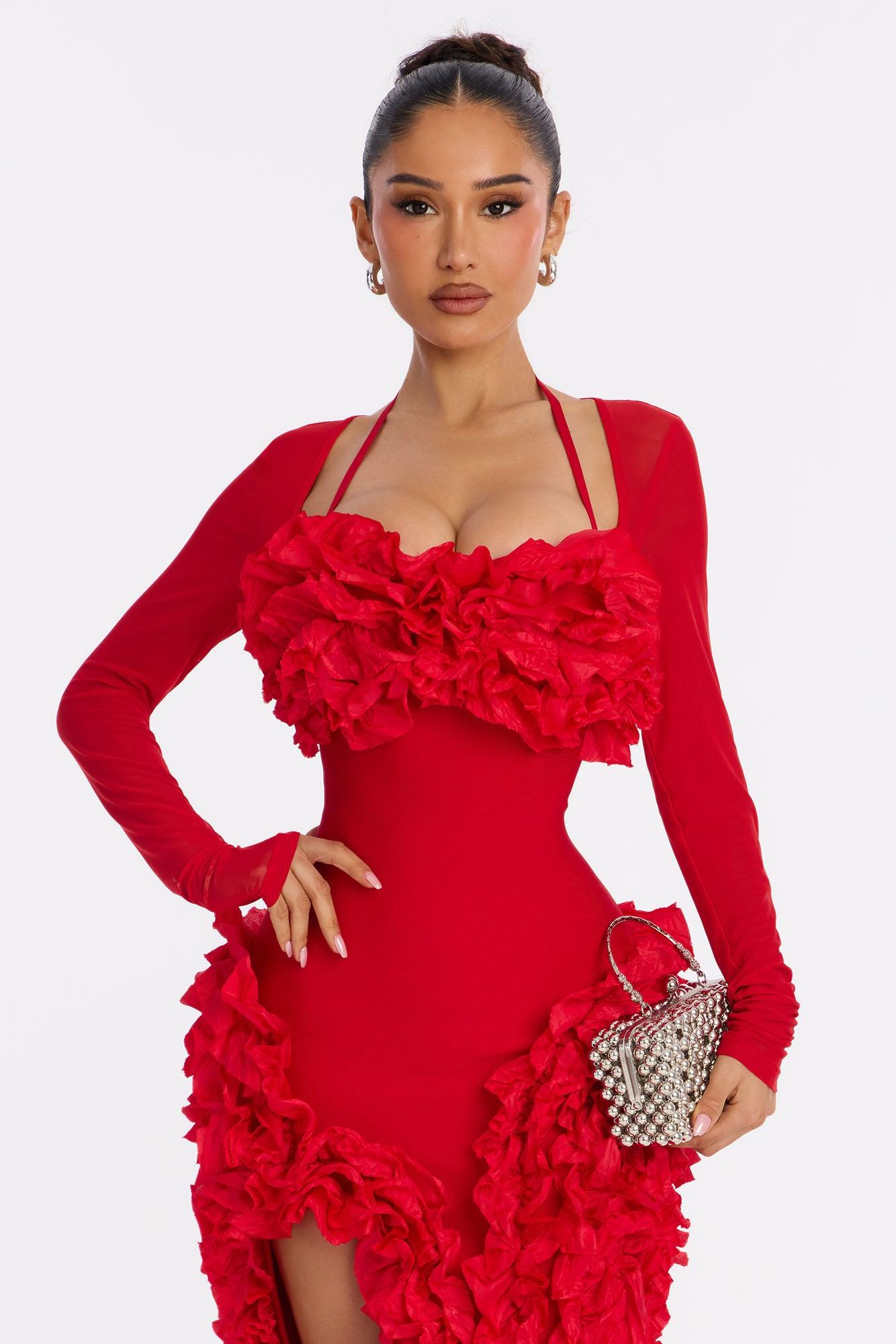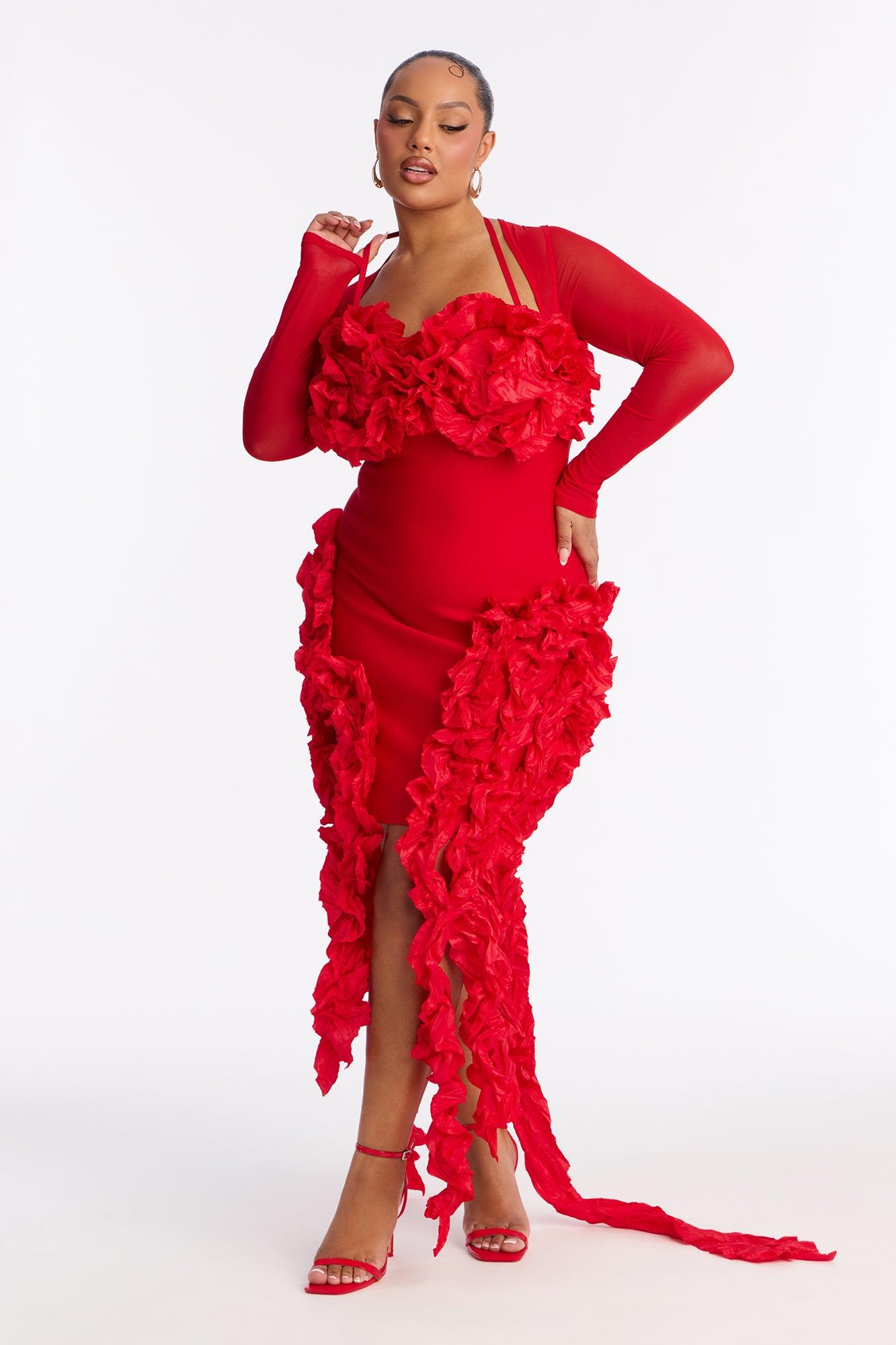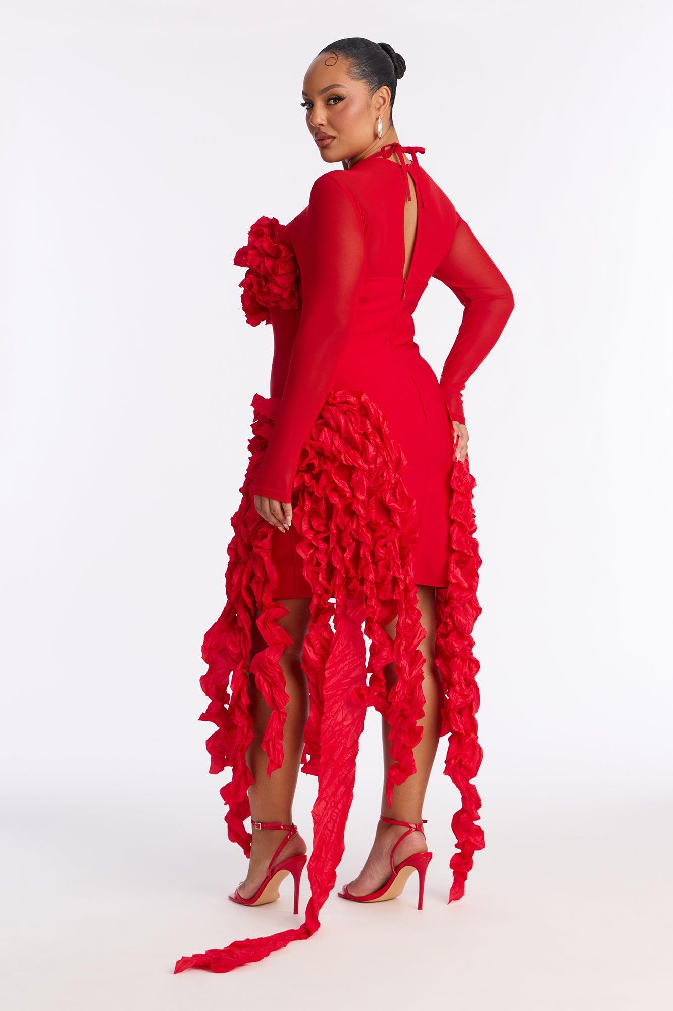 Available In Black And Red. Bandage Mini Dress Sweetheart Neckline Long Sleeve Ruffle Hidden Back Zipper Stretch Length Measured Flat = 32" Self: 95% Polyester 5% Spandex Contrast1: 90% Polyester 10% Spandex Contrast2: 100% Polyester Lining: 100% Polyester Imported