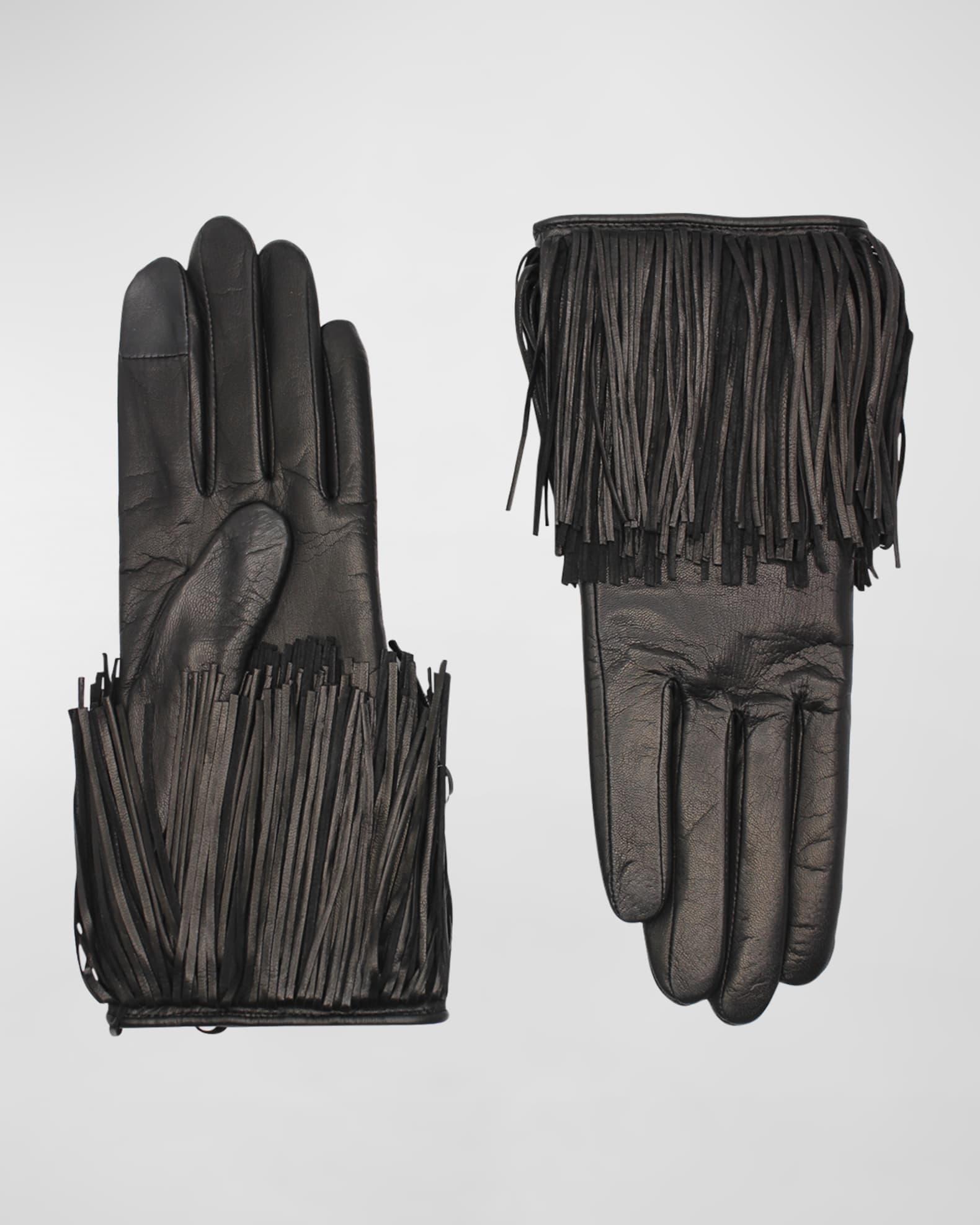 Agnelle "Lena" leather gloves with fringe trim Lambskin leather Professional cleaning recommended Made in France To determine your glove size, measure the circumference of your hand around your knuckles, excluding your thumb. Then pick your glove size based on the measurements below. For the most comfortable fit, you may want to go up a size if you fall in between these numbers. S=6 to 6 1/2 inches M=7 to 7 1/2 inches L=8 to 8 1/2 inches