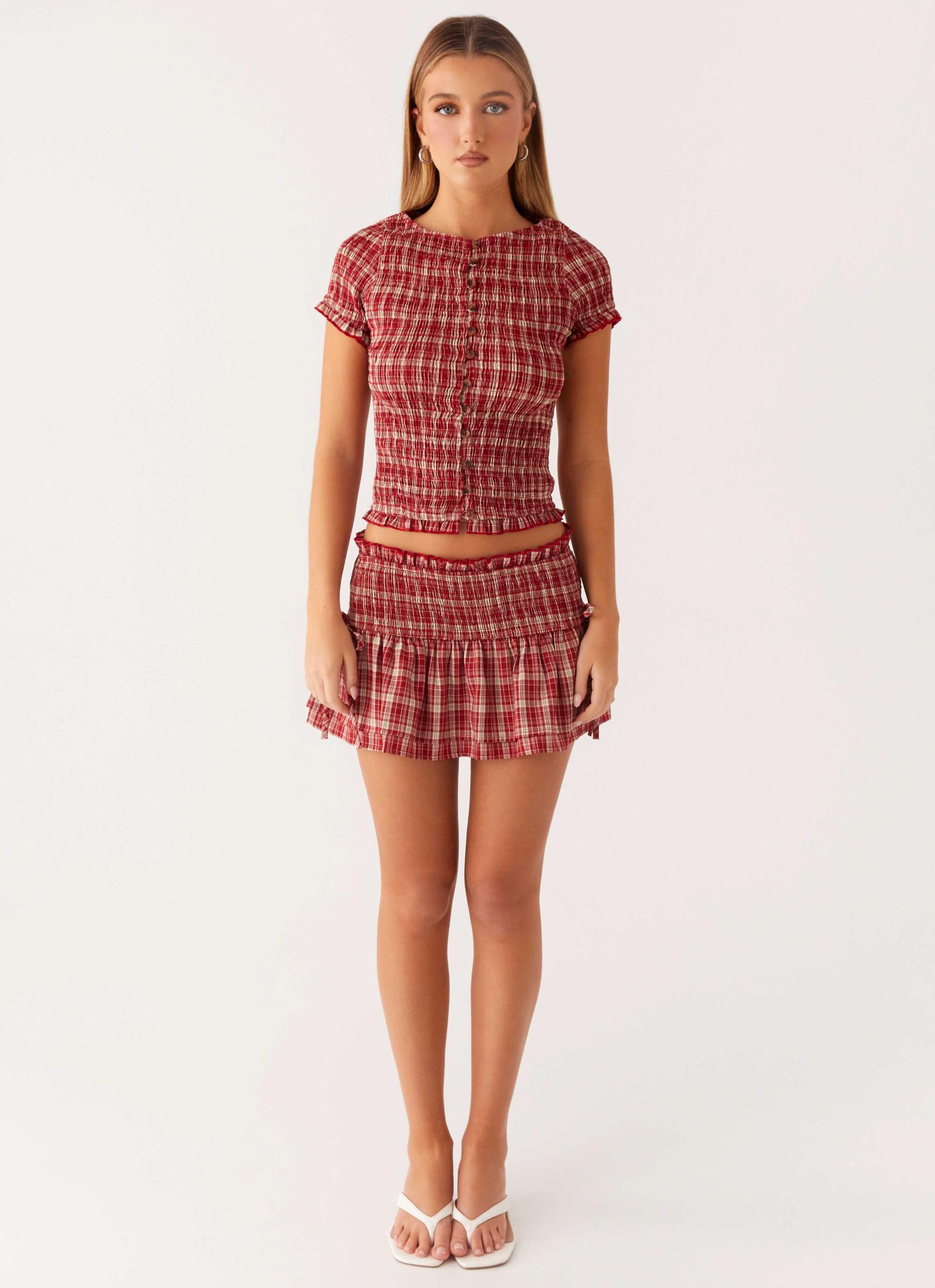 Peppermayo Exclusive The Lenore Button Top brings a romantic edge to your evening edit. Featuring a boat neckline with ruched fabric and frilled cuffs, this piece is crafted in our exclusive print with front buttons and an elasticated neckline for a flattering fit. - Boat neckline- Ruched material- Front buttons- Frilled cuffs- Elasticated neckline- Exclusive print (placement may vary)- Fabric: 95% Polyester, 5% Elastane, Lining: 100% Cotton Size AU 8 / US 4 garment measurements:Bust: 66 cm / 25.98 inWaist: 59 cm / 23.23 inHem: 68 cm / 26.77 inLength: 49 cm / 19.29 in Yasmin is 174 cm and wearing a size AU 6 / US 2