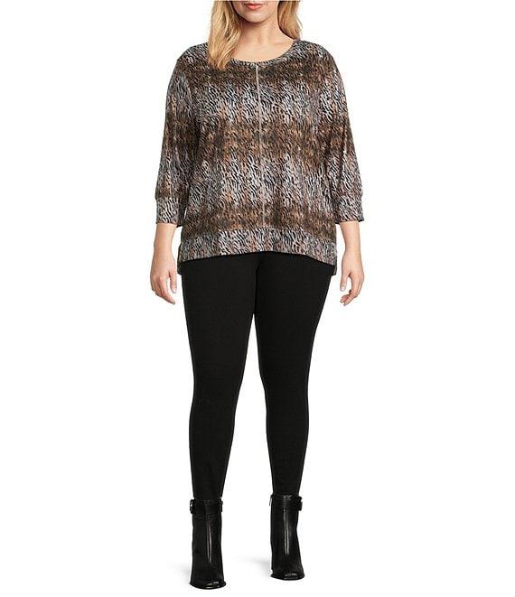 From Leo & Nicole Plus, this top features: Hacci knit fabrication Crew neckline 3/4 sleeves Relaxed fit Zebra strike print Ribbed trim detail Straight hemline Pullover construction Polyester/spandex Machine wash cold/tumble dry Imported.