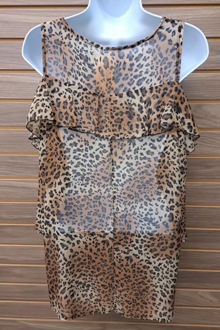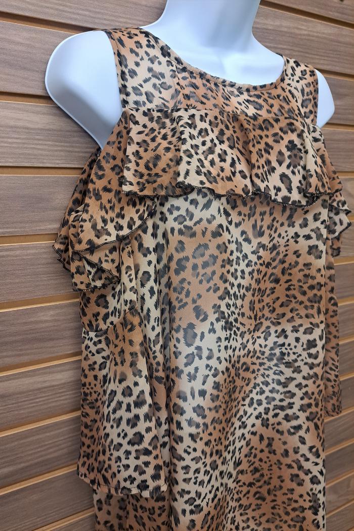 This stylish leopard-print blouse features cold shoulder 3/4 length sleeves and a ruffle detail in 100% polyester, perfect for any occasion. The comfortable slip-on design lets you stay cool and confident all day long.