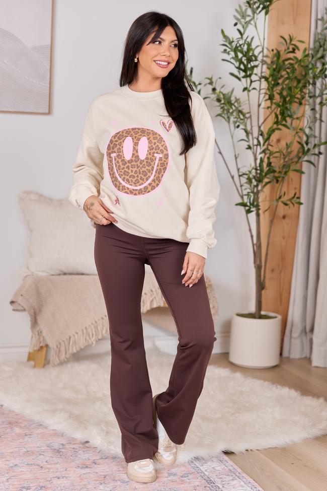 Details Cream crewneck with leopard smiley face heart design Relaxed fit Crew neckline, long sleeves Size small from shoulder to hem: 26" Material and Care Pink Lily Exclusive Sweatshirt 57% Cotton/43% Polyester Hand wash cold, no drum drying Patterns may vary Materials may have natural variations Colors may vary from different viewing device PLEASE NOTE: You may notice some off-white residue or slight discoloration when you first receive your shirt. Please do not worry! This comes from the special solution we use for printing the design on your shirt. It can sometimes leave marks during the drying process. These are not stains and will wash off after the first wash cycle. To keep your shirt's design as beautiful as possible, we do recommend washing this garment inside out on the gentle cycle with cold or lukewarm water. You can either tumble dry low or line dry.