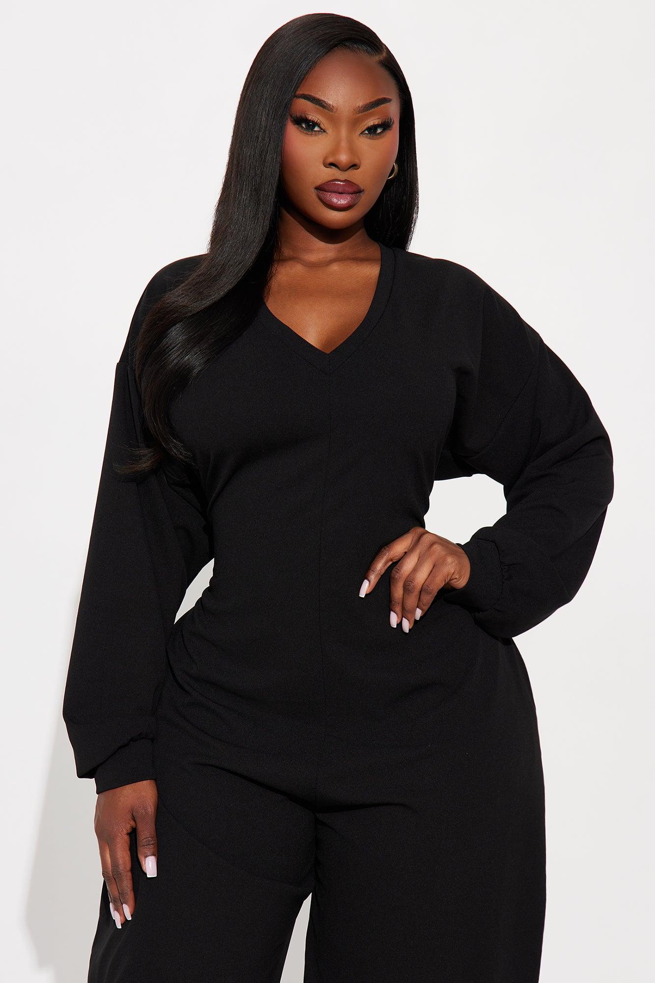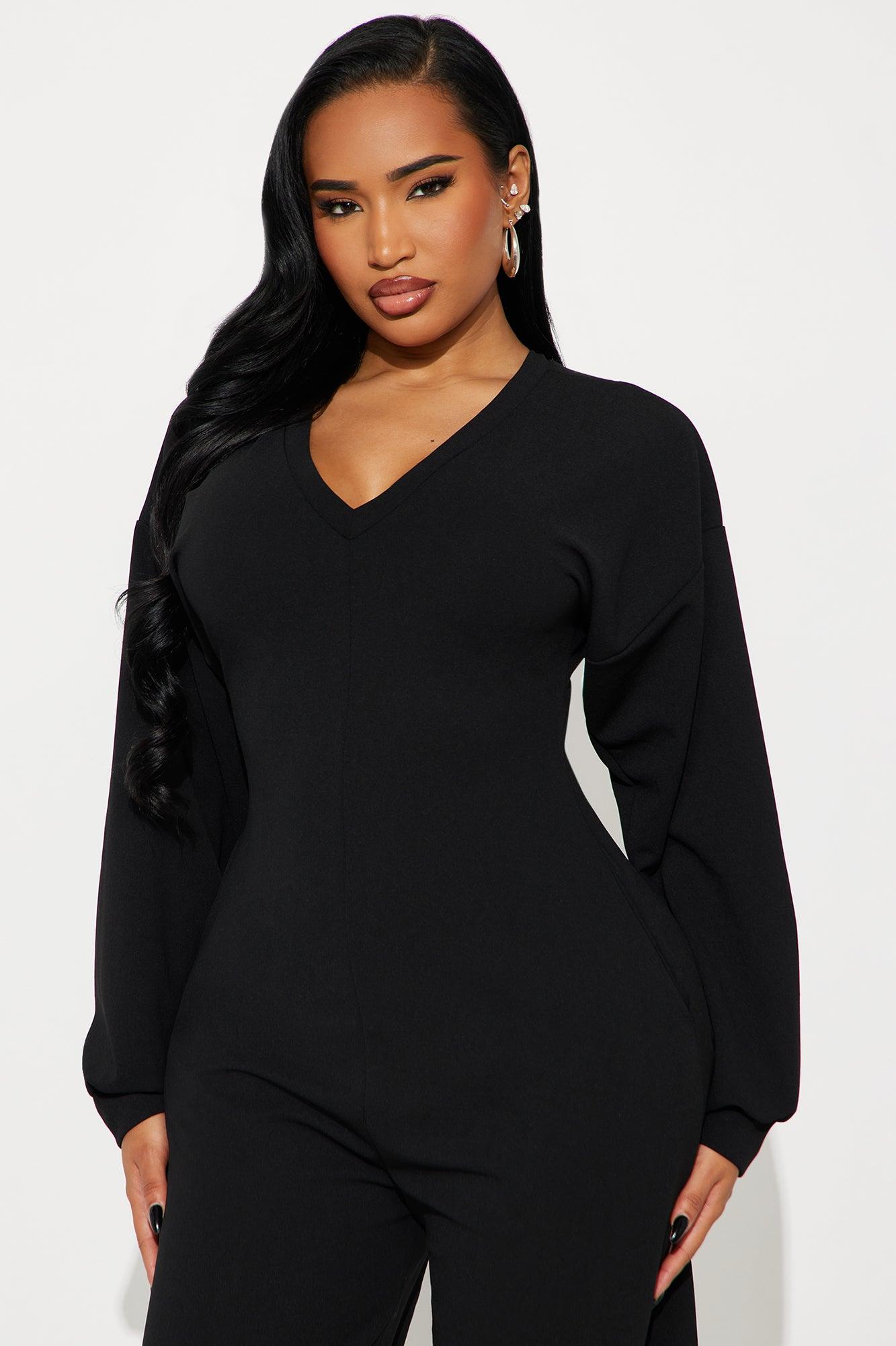 Available In Black. Jumpsuit Stretch Long Sleeve Wide Leg Jumpsuit V Neck Tie Back Detail Barrel Wide Leg Elastic Waistband Pockets 28.5" Inseam Self : 95% Polyester 5% Spandex Imported