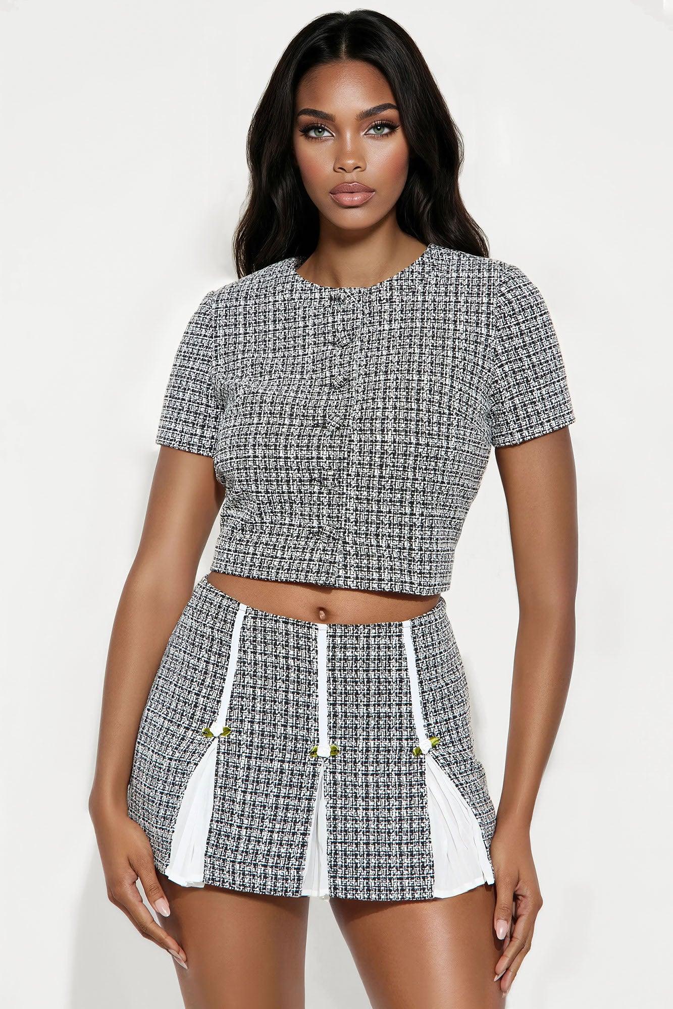 Let's have Tea Tweed Cropped Short Sleeve Blazer - Black Female