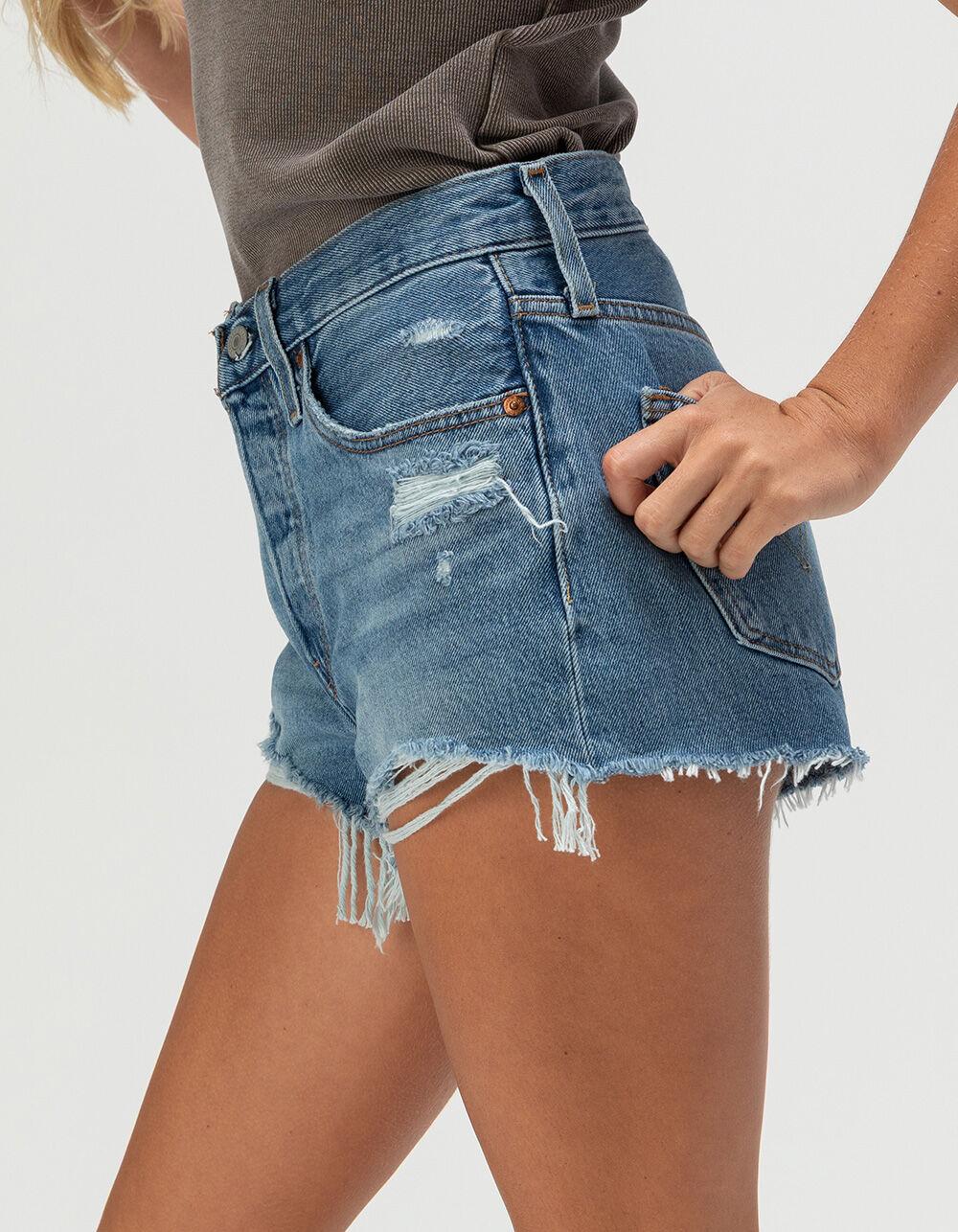 Levi's 501 Original Fit High Rise Demin Shorts - Blow Big Horns. 5-pocket denim styling. Button closure with zip fly. Belt loop waist. High rise. Rip details throughout and raw hems. Approximate inseam: 2". 100% Cotton. Machine wash. Imported.
