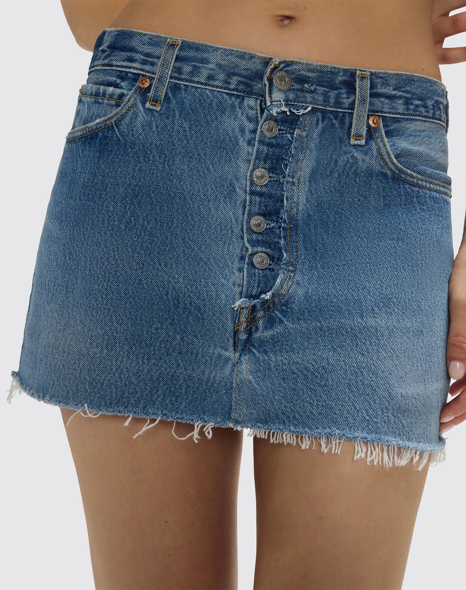 The RE/DONE Levi's The Lynn is a classic mini denim skirt with a cut out fly with exposed button fly and ultra mini-length. Every skirt is completely one-of-a-kind and was reconstruction and imagined in Los Angeles