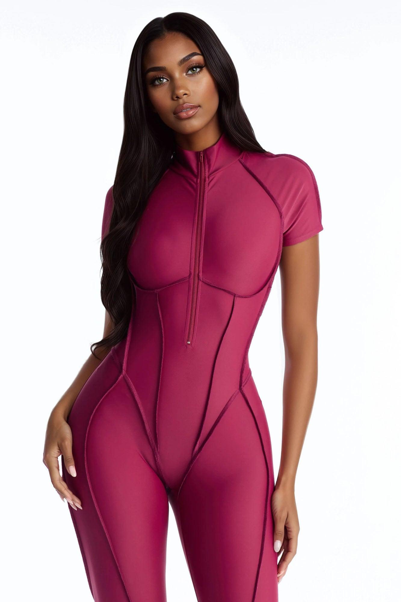 Available In Black And Burgundy. Jumpsuit Stretch Short Sleeve Mock Neck Skinny Leg Zipper Front Detail 19.5" Inseam 82% Nylon 18% Spandex Imported California Proposition 65WARNING: Cancer and Reproductive Harm - www.P65Warnings.ca.gov.