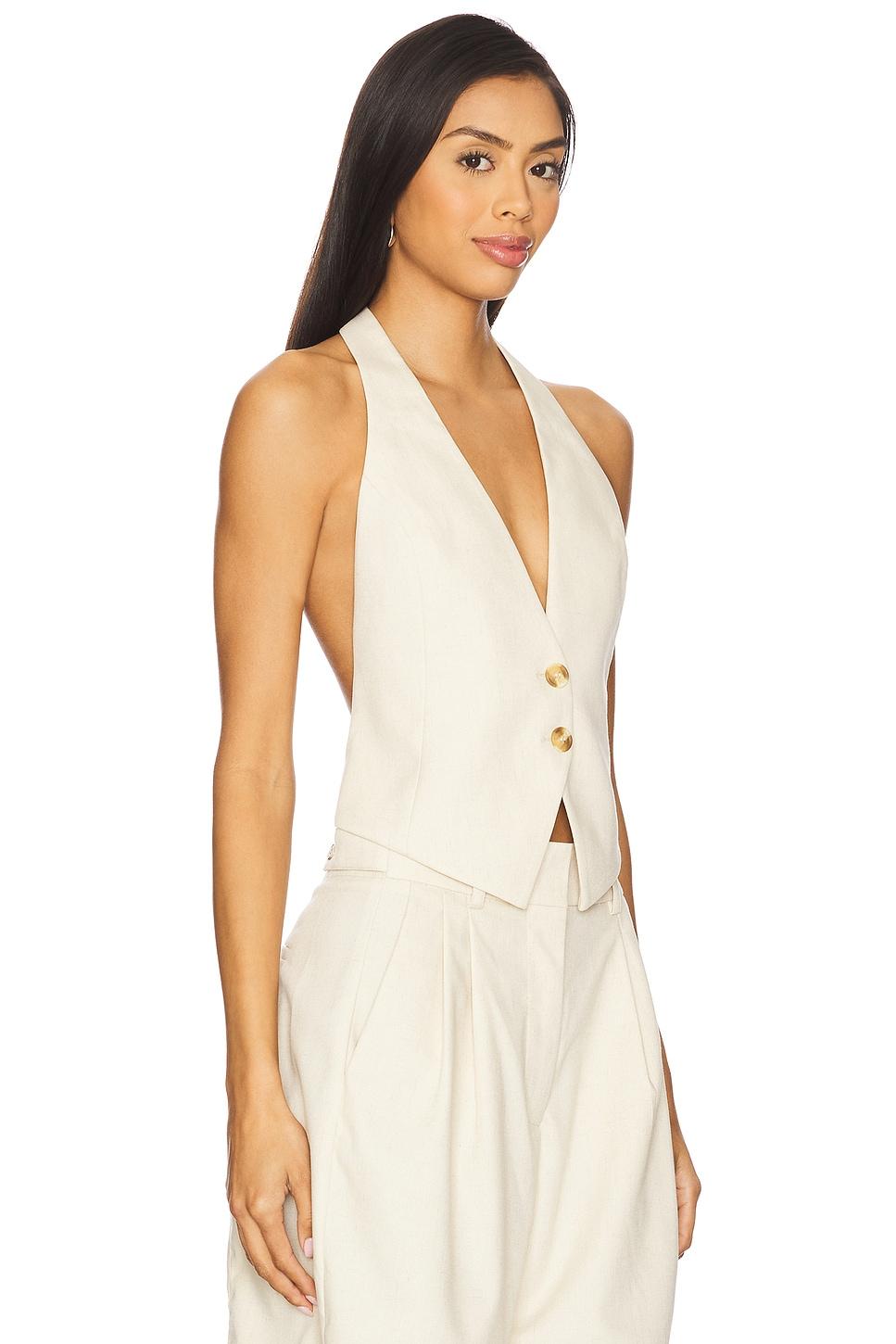 90% polyester, 8% linen, 2% spandex. Dry clean only. Halterneck button closureBack button closureFront button closure. Open back. Linen fabric. Item not sold as a set. Made in China. Revolve Style No. RONR-WS469. Manufacturer Style No. 417693LIN.