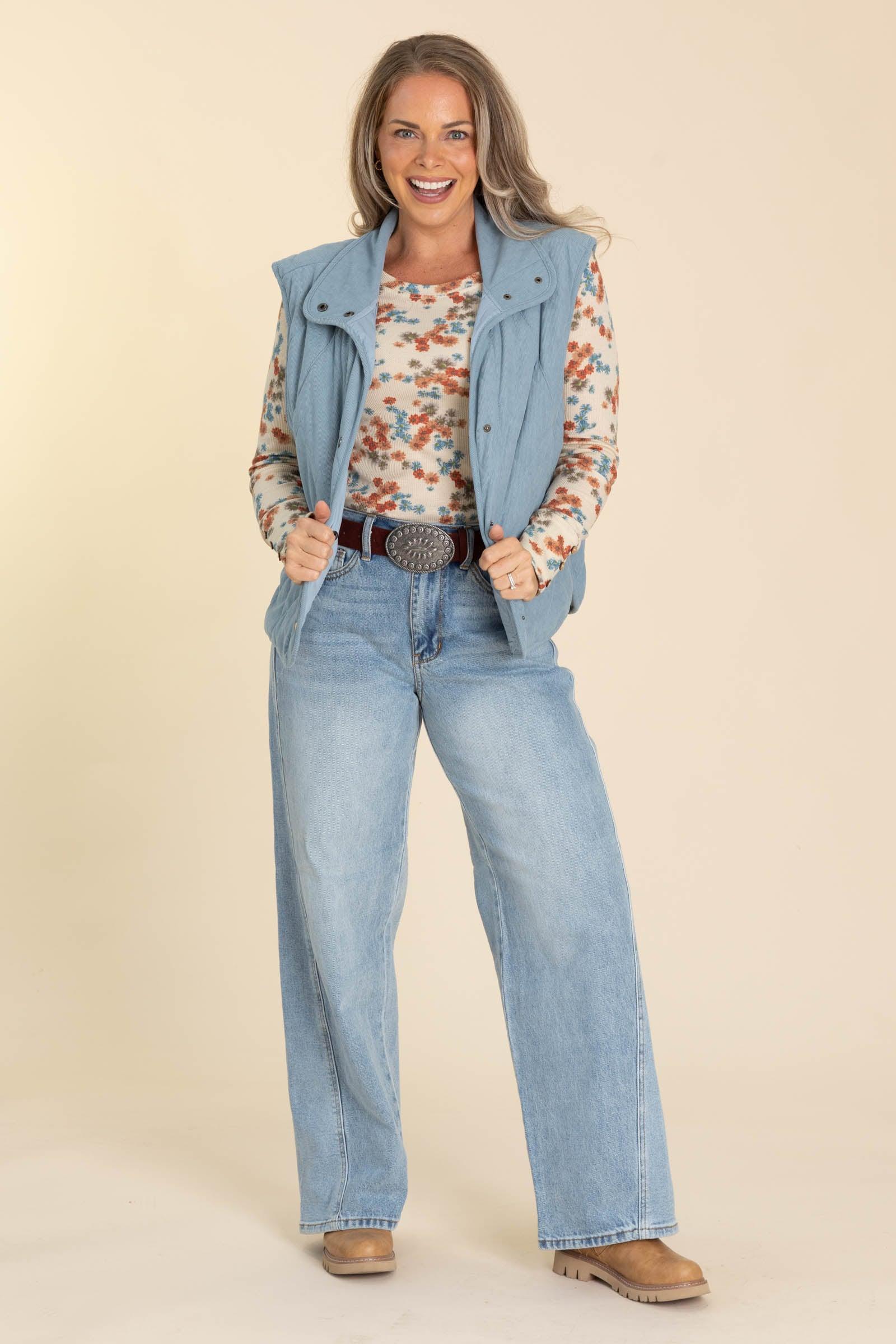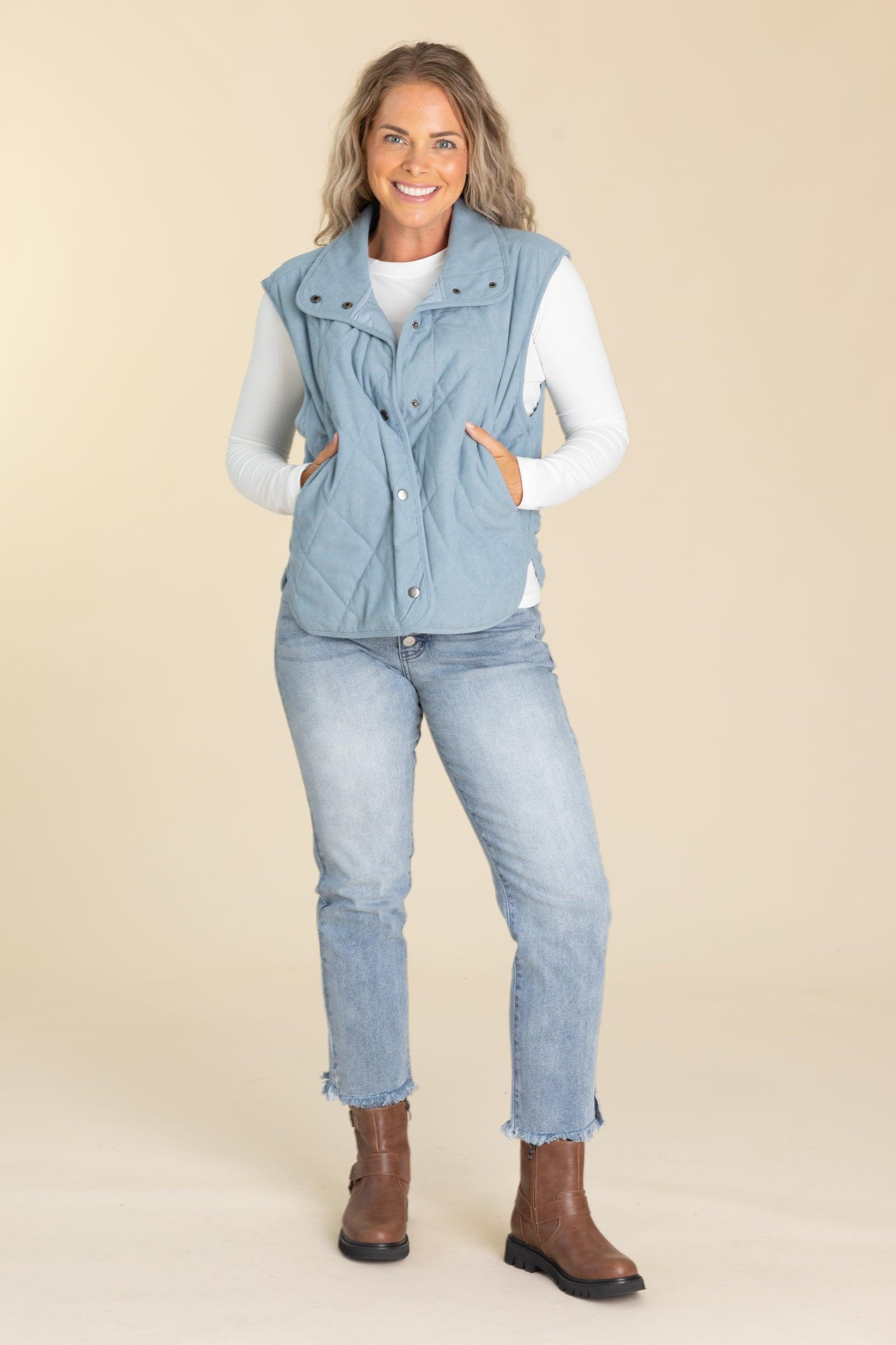 Product Details Colors: Green/ Dusty Blue/ Taupe Print: Quilted Corduroy Neckline: Button Down Sleeve: Sleeveless Hemline: Round Brand: Haptics Material and Care 100% Polyester Machine Wash Cold Tumble Dry Low Size and Fit Small: Bust 44" Waist 44" Length 24" Medium: Bust 46" Waist 46" Length 24.5" Large: Bust 48" Waist 48" Length 25" Erica is 5’7” and wearing her true size small