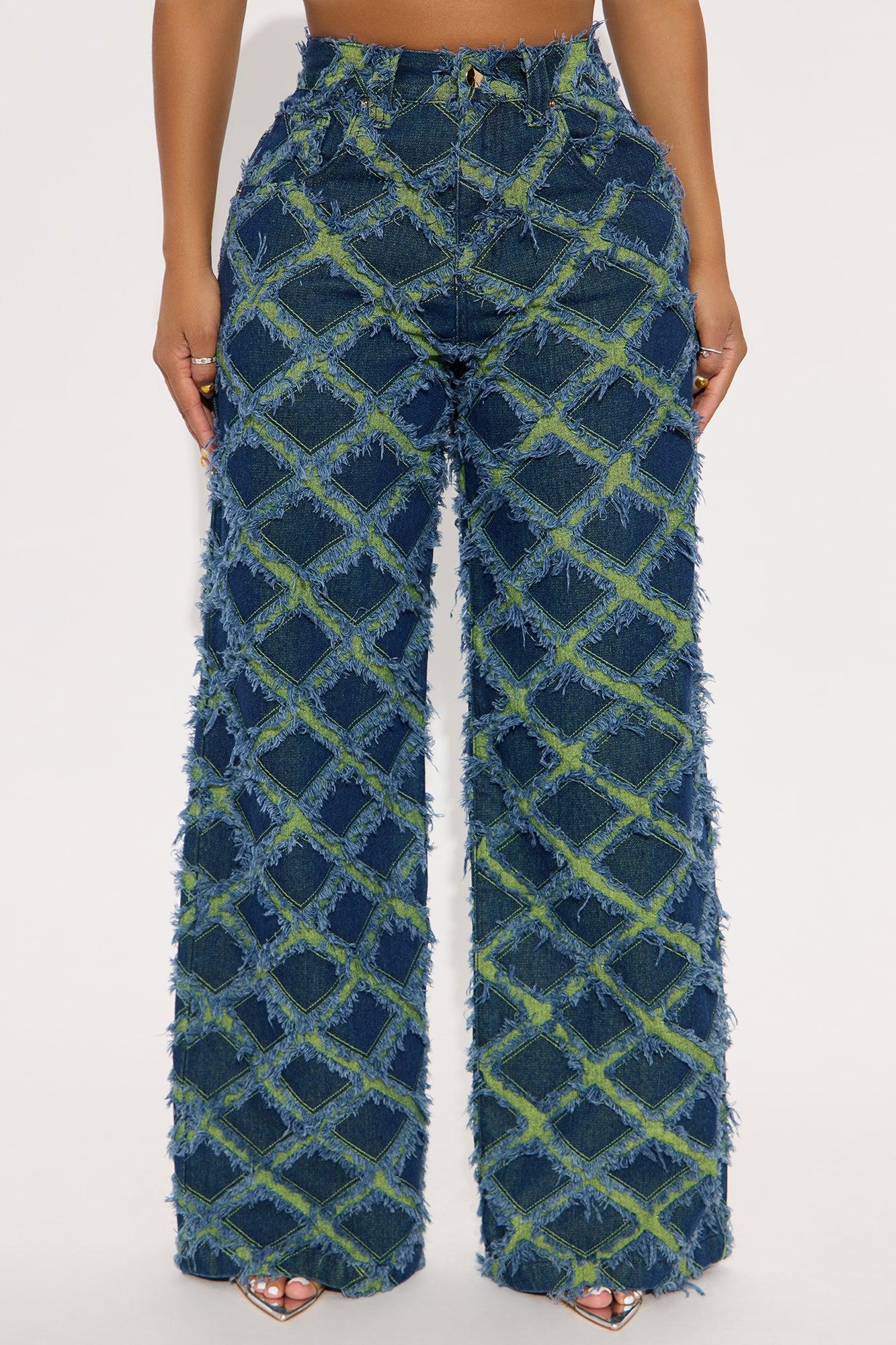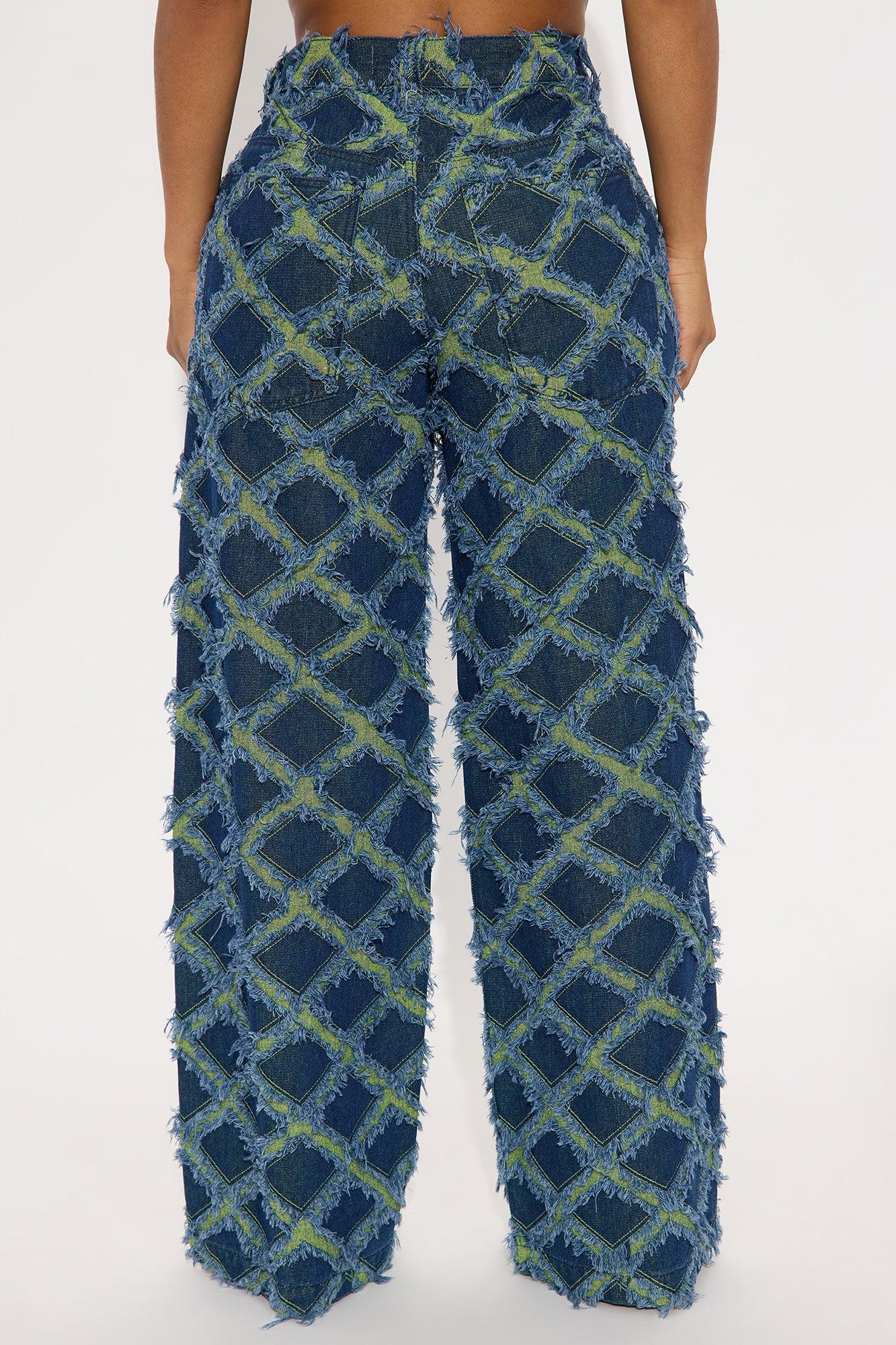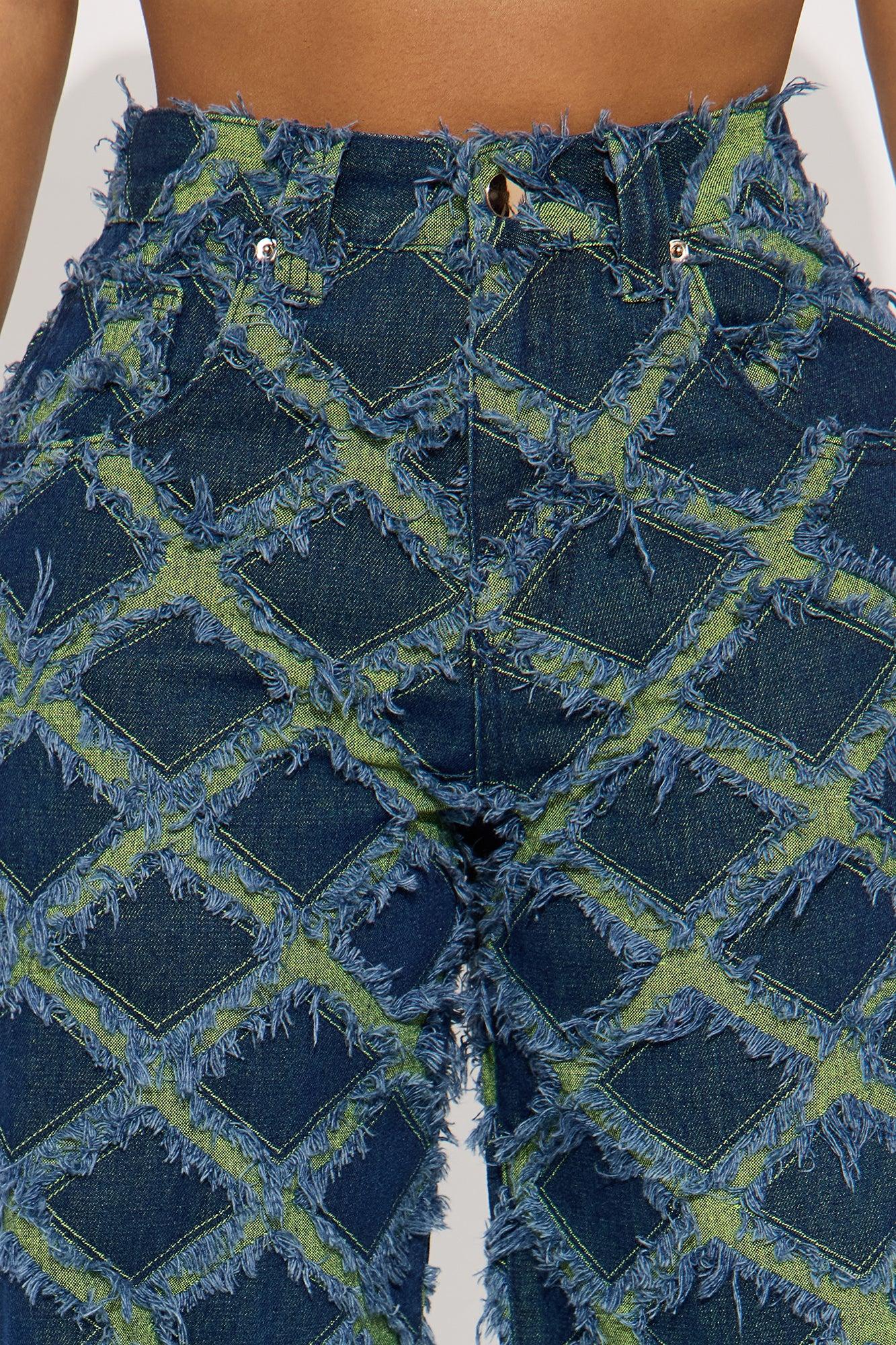 Available In Dark Wash. Wide Leg Jean 5 Pocket Fray Detail Jacquard Pattern 12.5" Rise 33" Inseam Non-Stretch Disclaimer: Due To The Specialized Wash and Frayed Detail Each Garment Is Unique. 85% Cotton 15% Polyester Imported