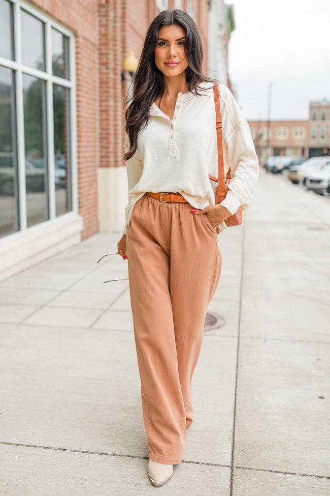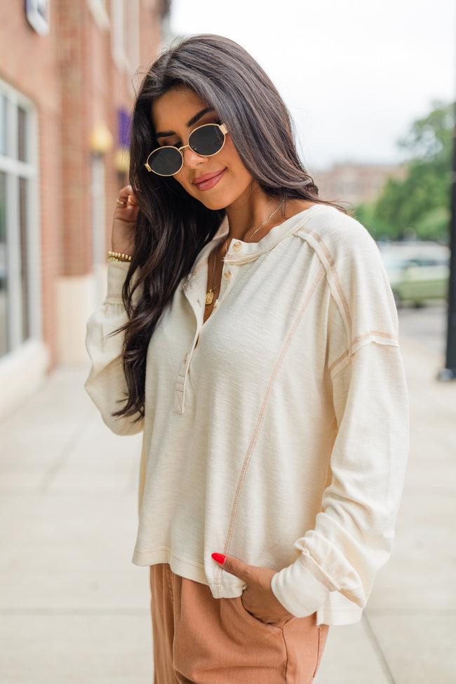 Details Cream Contrast Stitch Henley Fabric has stretch Henley detail, exposed hem, contrast stitch, bottom hem split Pair this top with a cute pair of jeans! Unlined Size small from shoulder to hem: 17.5" Material and Care 64% polyester 32% cotton 4% spandex Hand wash cold, no drum drying Patterns may vary Materials may have natural variations Colors may vary from different viewing devices.
