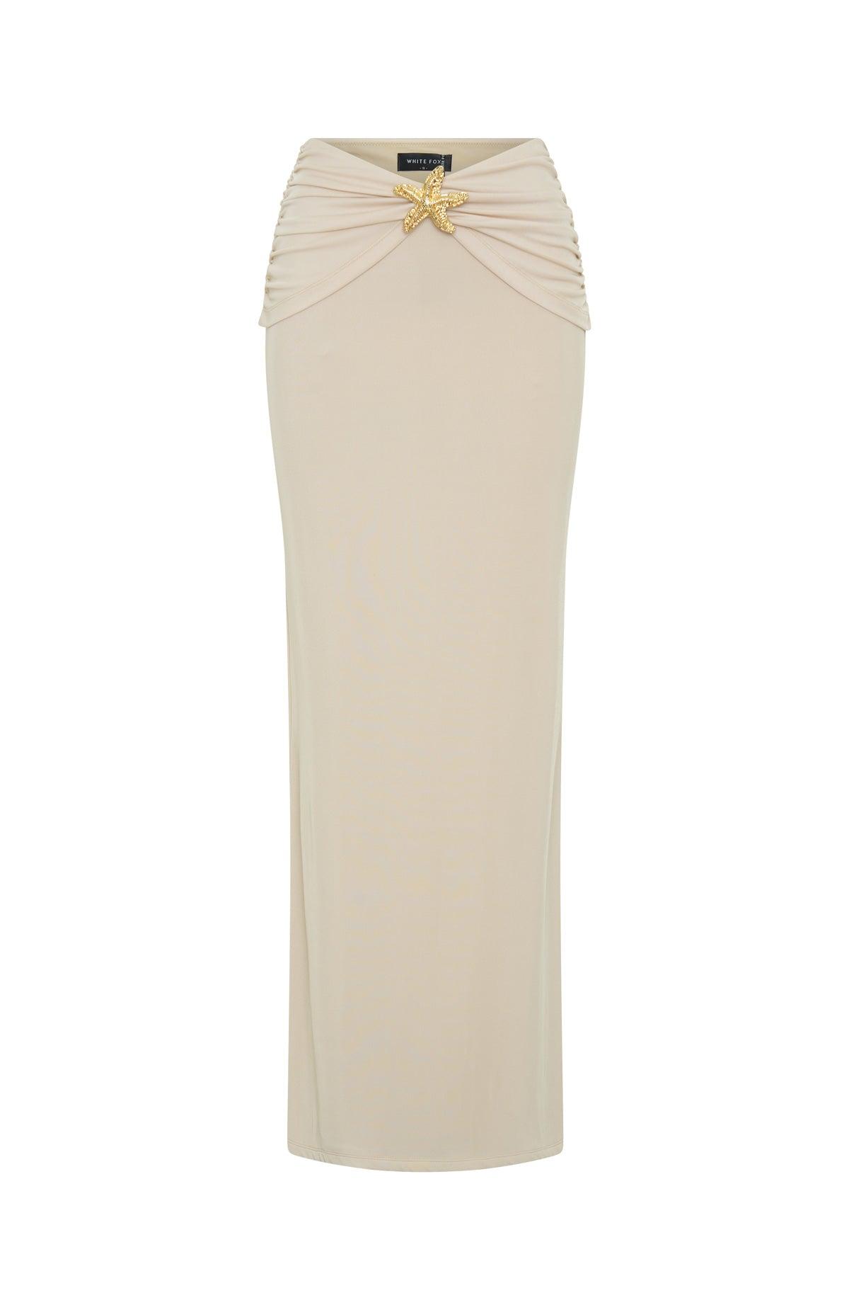 Steal all the attention in our Lil Mermaid Maxi Skirt in Latte! Features thin elasticated waistband, ruched detailing on side, draped fabrication gathered centre front with an oversized shell gold hardware detailing and lined. Team with the matching Lil Mermaid Strapless Top in Latte for a stunning dinner fit! 95% Polyester 5% Spandex Ash is 166cm & wears an XS