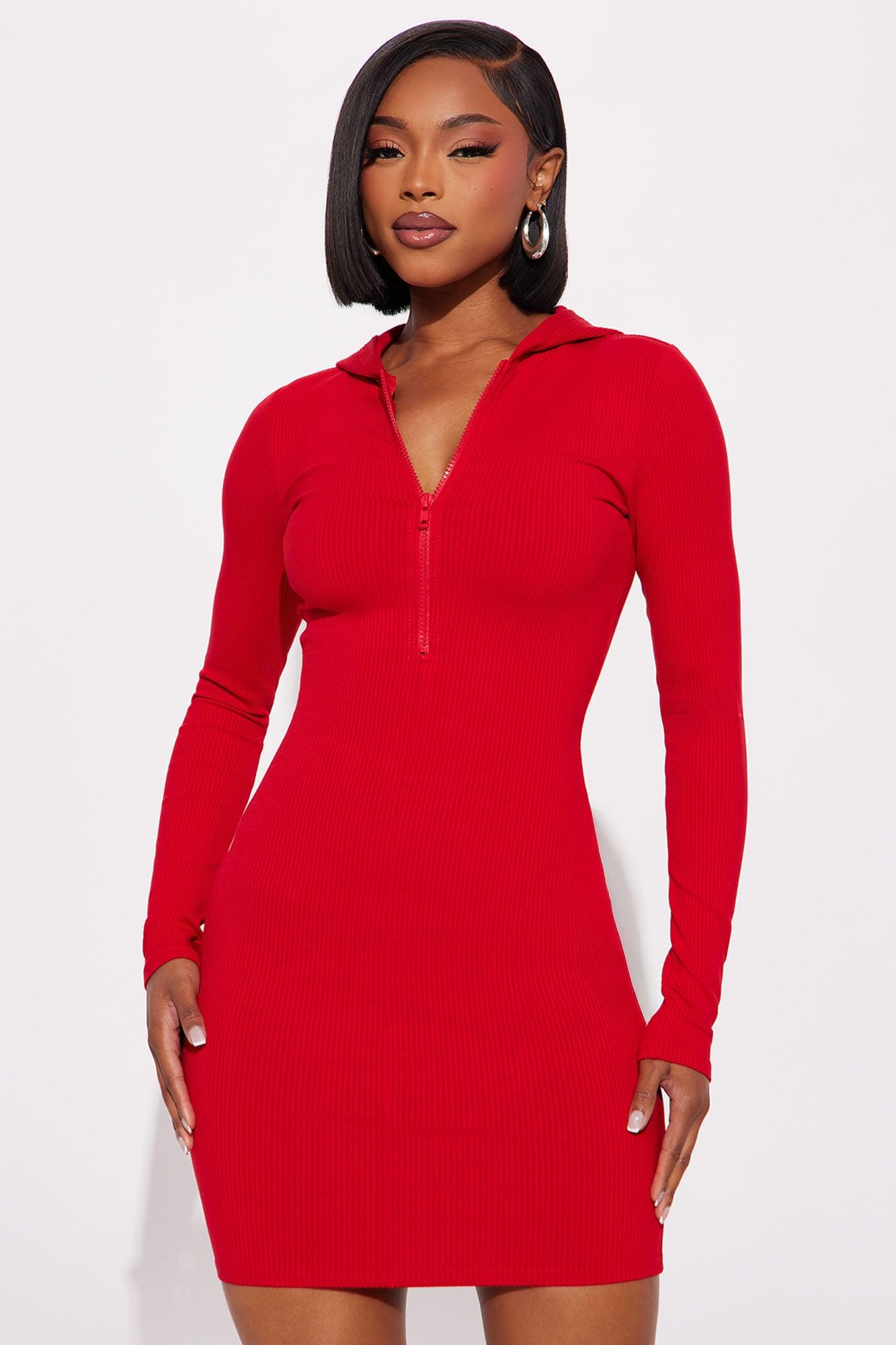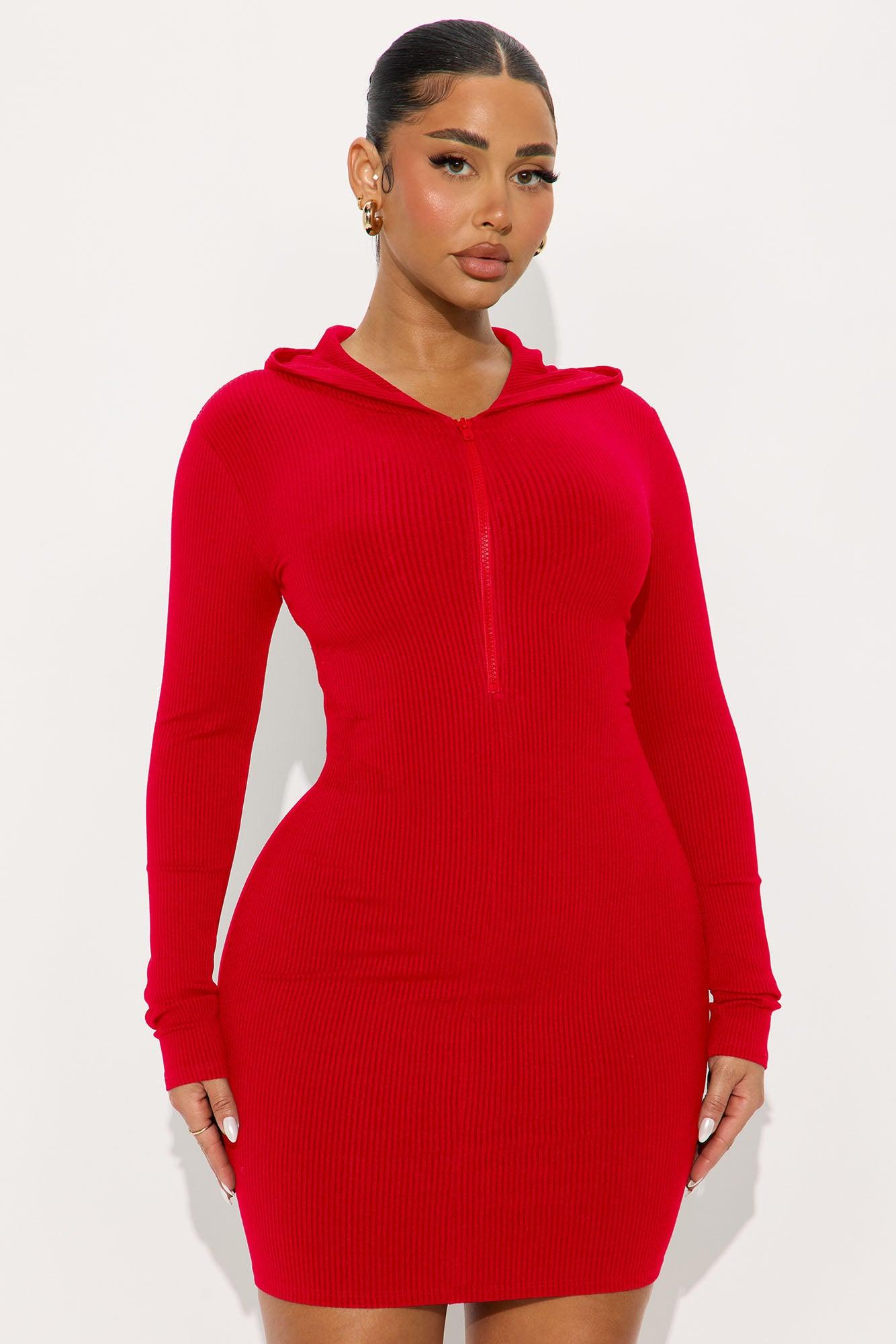 Available In Black, Brown And Red. Snatched Mini Dress High Neckline Long Sleeve Zipper Detail Hooded Stretch Length Measured Flat = 32" Self: 86% Rayon 14% Spandex Imported