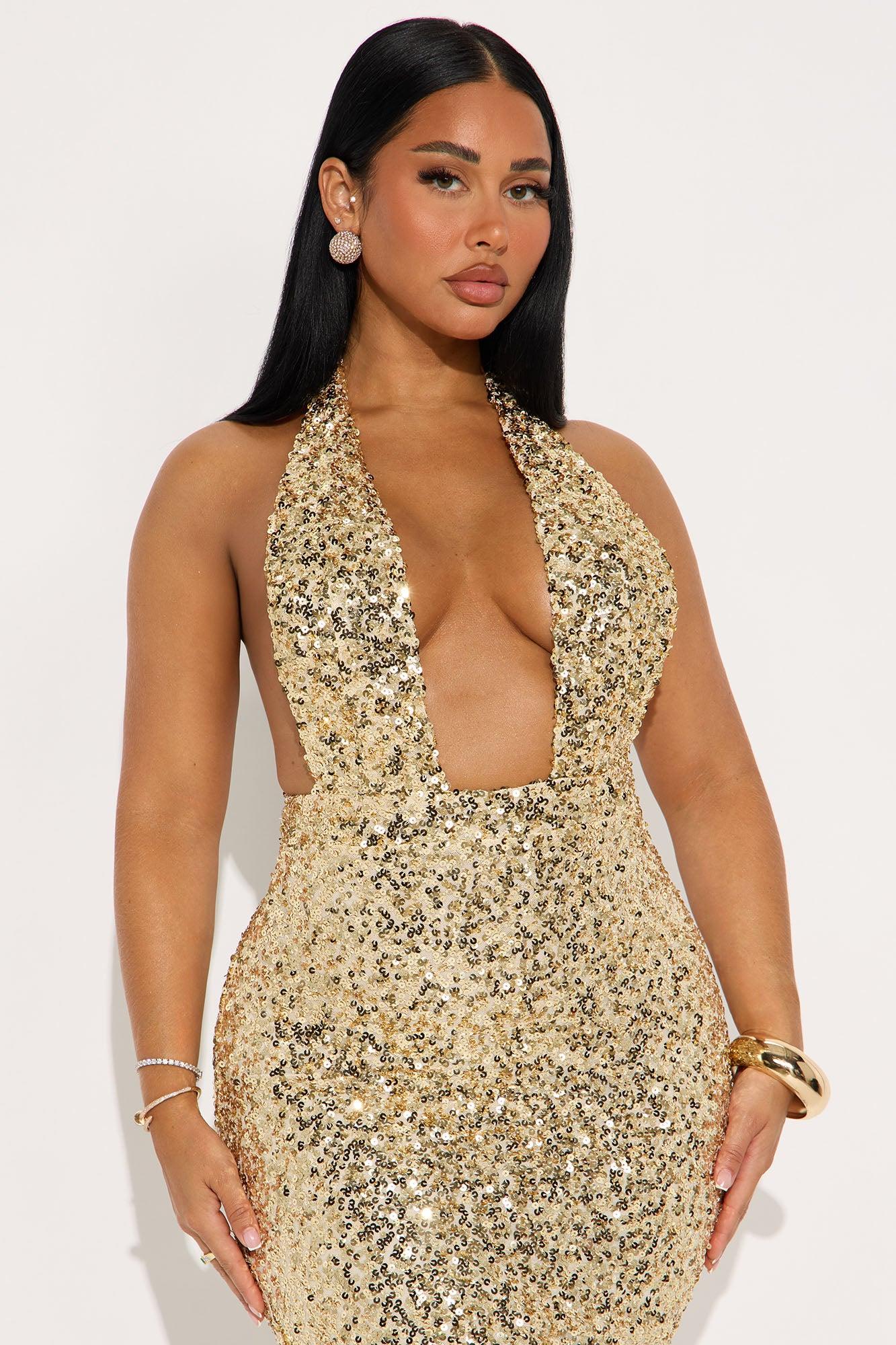 Available In Black And Gold. Sequin Midi Dress Deep V-Neckline Halter Backless Lined Stretch Length Measured Flat = 37" Self 95% Polyester 5% Spandex Lining 100% Polyester Imported California Proposition 65WARNING: Cancer and Reproductive Harm - www.P65Warnings.ca.gov.