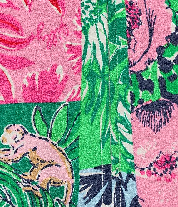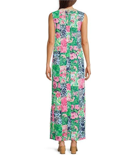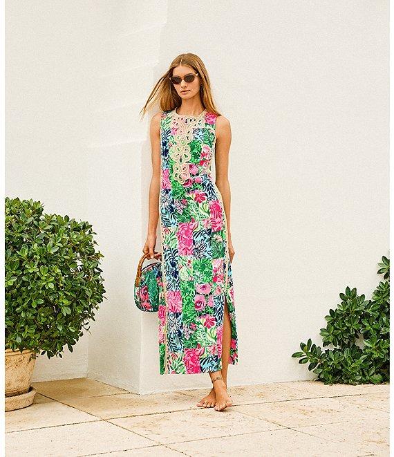 From Lilly Pulitzer, this dress features: Satin back crepe fabrication Party punch patch print Shift silhouette Crew neckline Sleeveless Lilly lace trim Side pockets Straight hem Back zip closure Approx. 40" length Polyester Hand wash Imported.