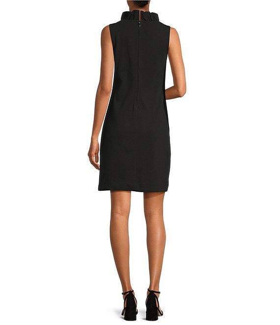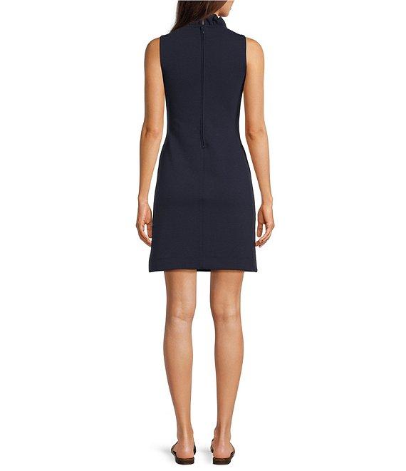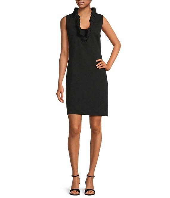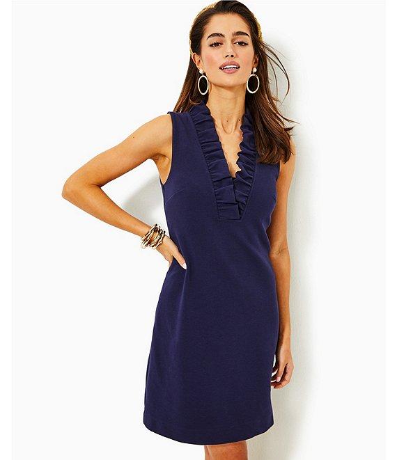 From Lilly Pulitzer, this dress features: Knit fabrication Sheath silhouette V-neckline Sleeveless Ruffle detail at neckline Bra-friendly Unlined Straight hemline Back zipper closure Approx. 20.5" length Polyester/cotton/spandex Machine wash/dry flat Imported.