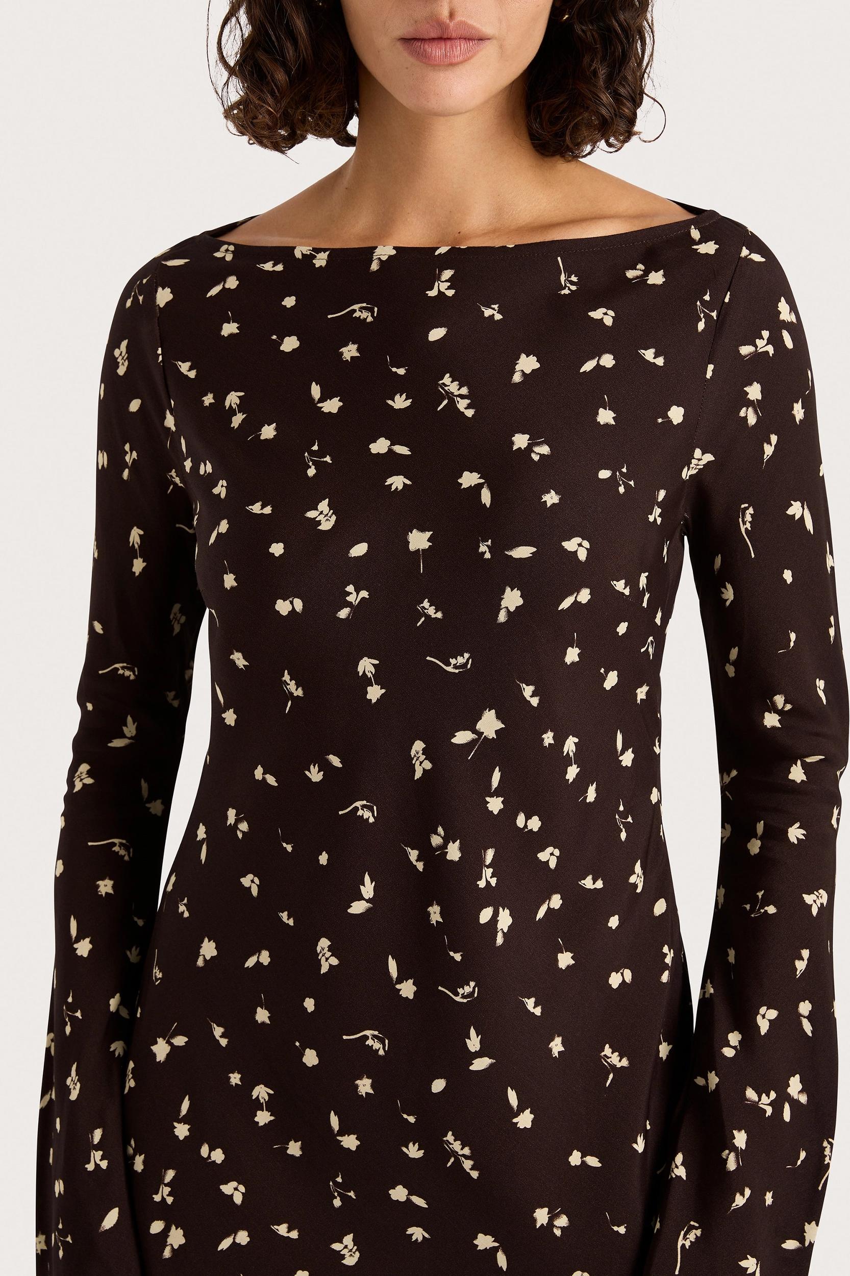 A feminine-style mini dress with a semi-fitted yet relaxed silhouette that falls in line with the body. Designed in a a rich chocolate brown hue with a subtle micro floral motif, it offers a boat-style neckline with long sleeves and a soft skirt. Designed with the changing seasons in mind, it is a shorter iteration of the Lilou Maxi Dress. Pare back with tonal accessories.
