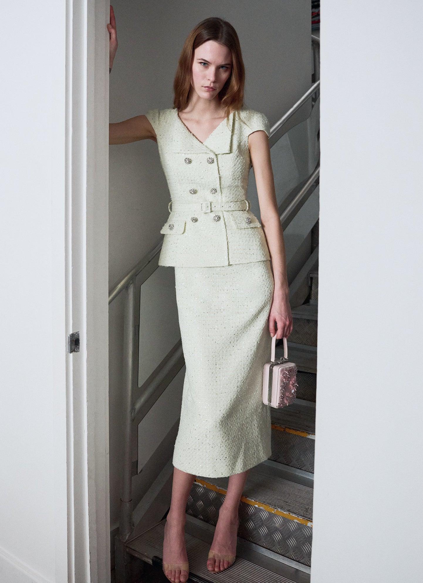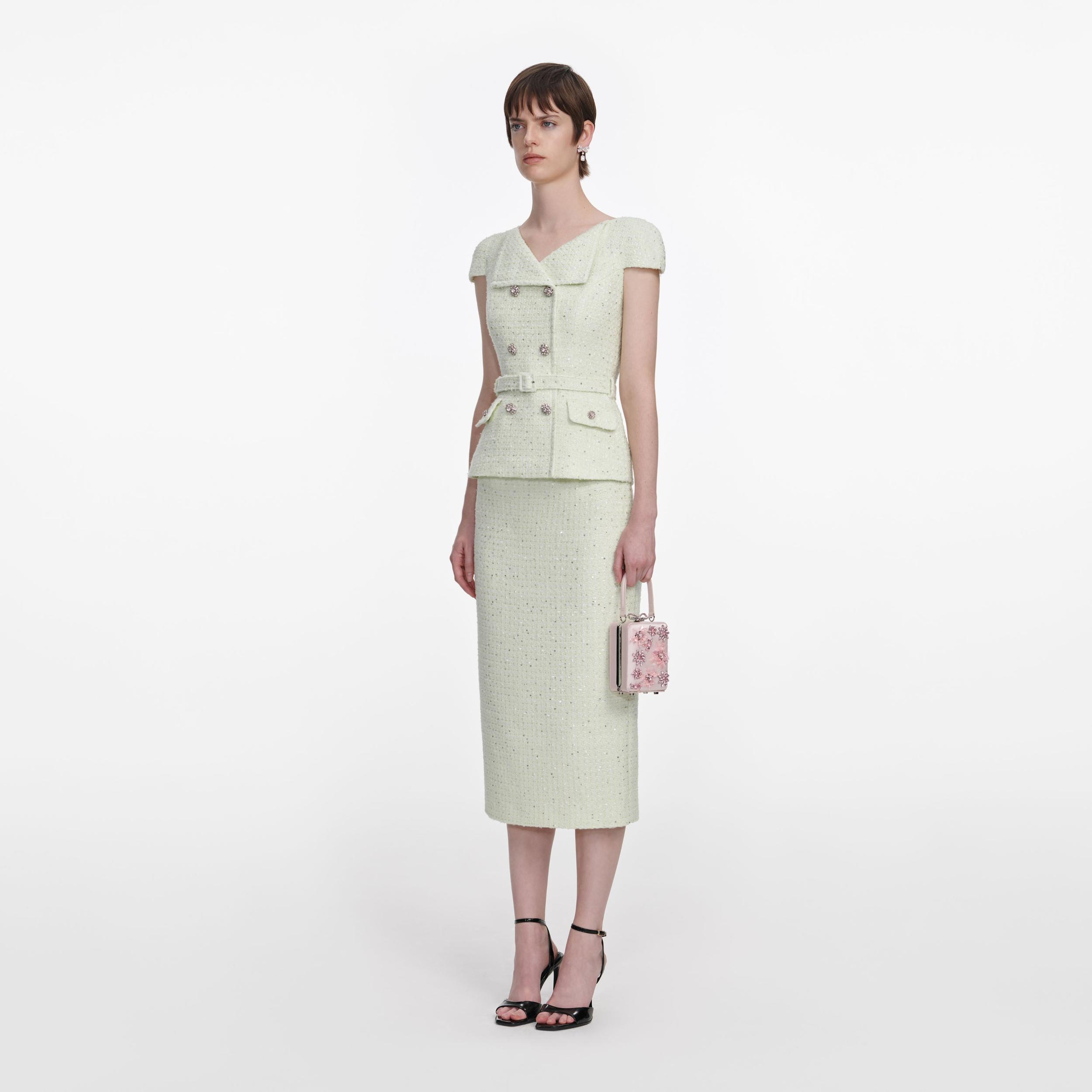 Fresh and minty, this bouclé midi dress channels vibrant energy with its lime green hue. A face-framing collar, diamanté buttons and belted waist add chic detail – wear with flats or heels alike.Fitted styleThis style has minimal stretchConcealed zip closure at backRemovable beltFunctional pocketsModel is 5ft10/178cm and wears a size UK 6