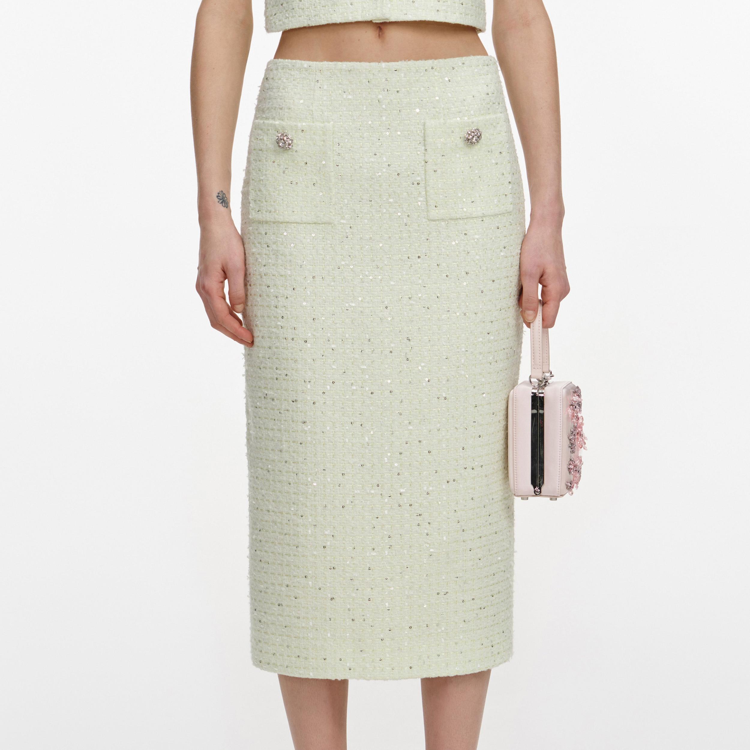 Fresh and minty, this bouclé midi skirt channels vibrant energy with its lime green hue. Diamanté buttons highlight its sleek cut – pair with our matching top for a modern take on the skirt suit. Fitted styleThis style has minimal stretchConcealed zip closure at backBelt not includedMatching top availableModel is 5ft10/178cm and wears a size UK 6