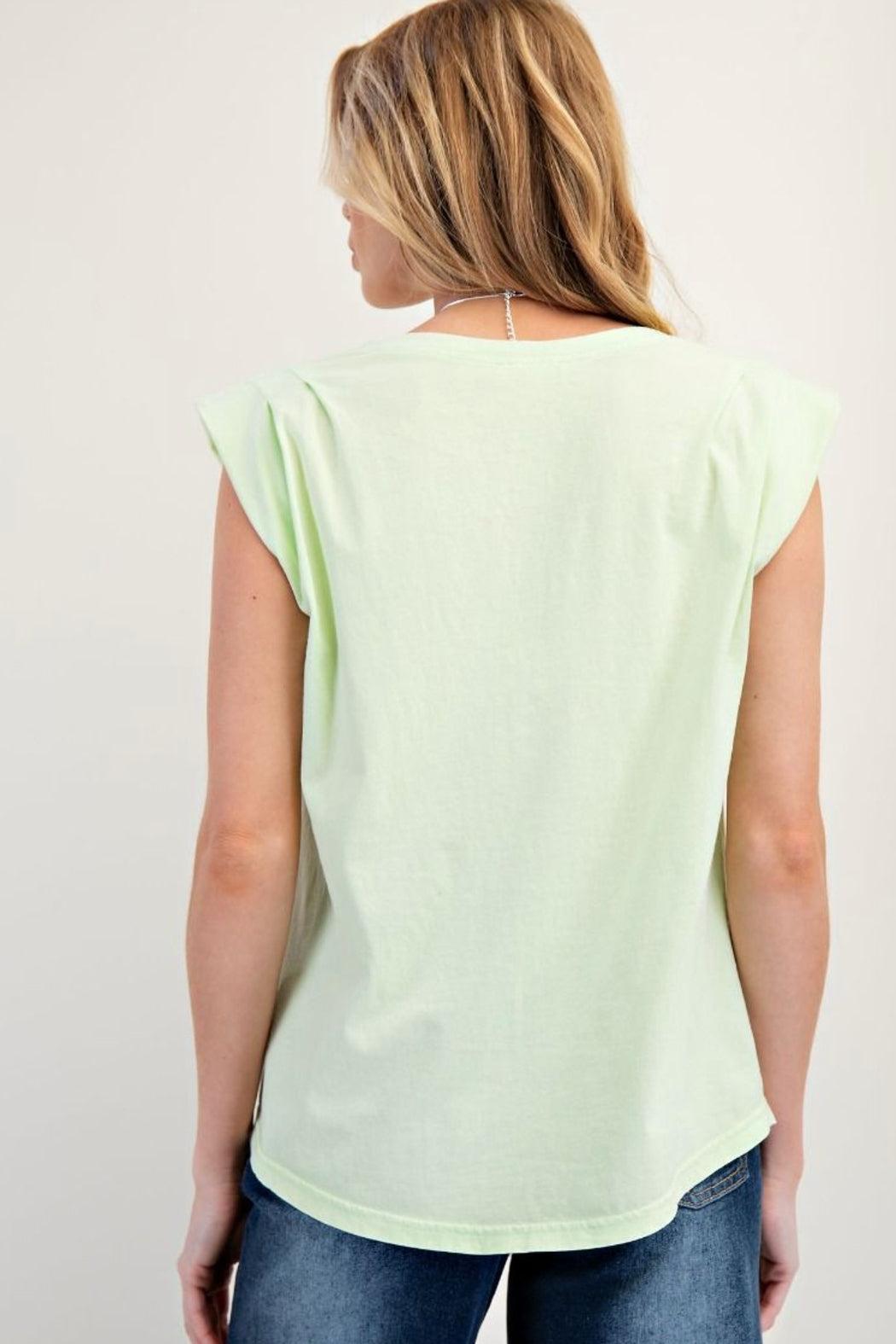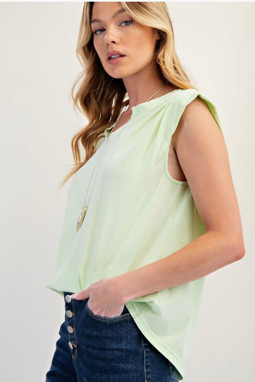 MINERAL WASHED COTTON KNIT TOP -SLEEVELESS -ATTACHED SHOULDER PADS -NOTCHED NECKLINE -ROUNDED HEM -PINTUCK DETAILING ON SHOULDER 100% COTTON