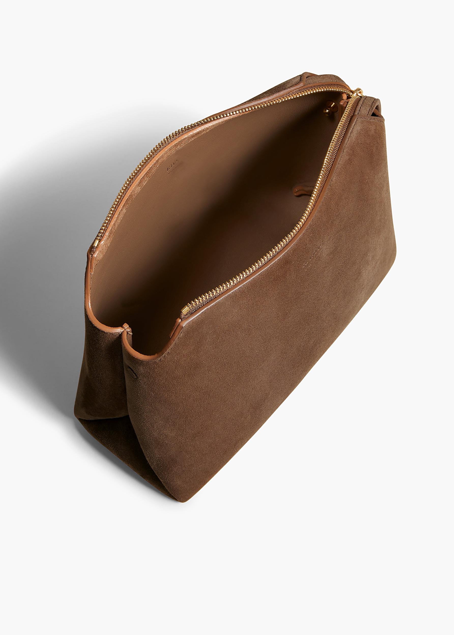 A lightweight zip-top bag with sculptural folds along the sides. Wear across the body on the removable strap or carry as a clutch.