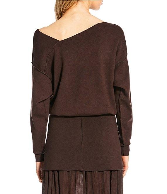 From Line and Dot, this sweater features: Sweater kit fabrication Off the shoulder Long sleeve Pull over construction Visible seam detail Approx. 21" Rayon/polyester/nylon Machine wash Imported.
