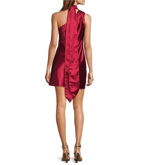From Line and Dot, this dress features: Satin fabrication One-shoulder neckline Sleeveless Side zipper with hook and eye closure Button closure around the neck for scarf Attached scarf Mini length Approx. 33" length Self: Polyester/spandex Lining: Polyester Dry clean only Imported.