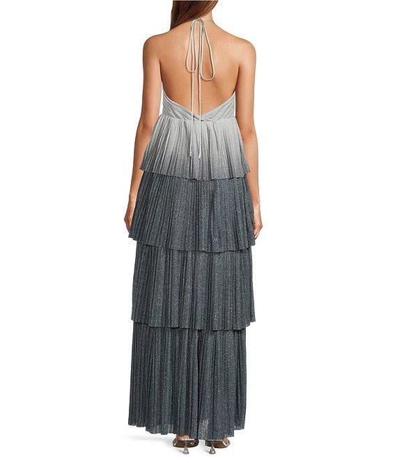 From Line and Dot, this dress features: Ombre print Thin halter neckline Sleeveless Side zipper/ hook & eye Flowy fit and flare silhouette Lace ribbon detail on chest Tiered ruffle hemline Maxi length Approx. 58.5" length Self: polyester/metal Lining: polyester Dry clean only Imported.