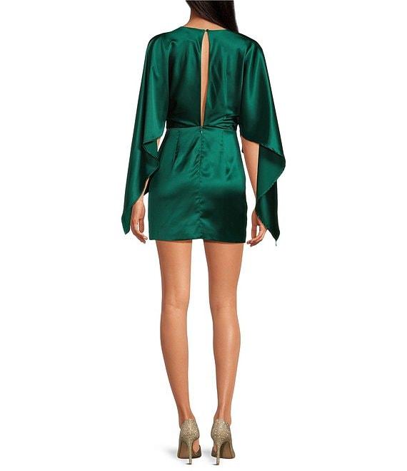From Line and Dot, this dress features: Satin fabrication Boat neckline Long cape sleeves Back zipper closure Mini length Approx. 32" length Self: polyester/spandex Lining: polyester Dry clean only Imported.