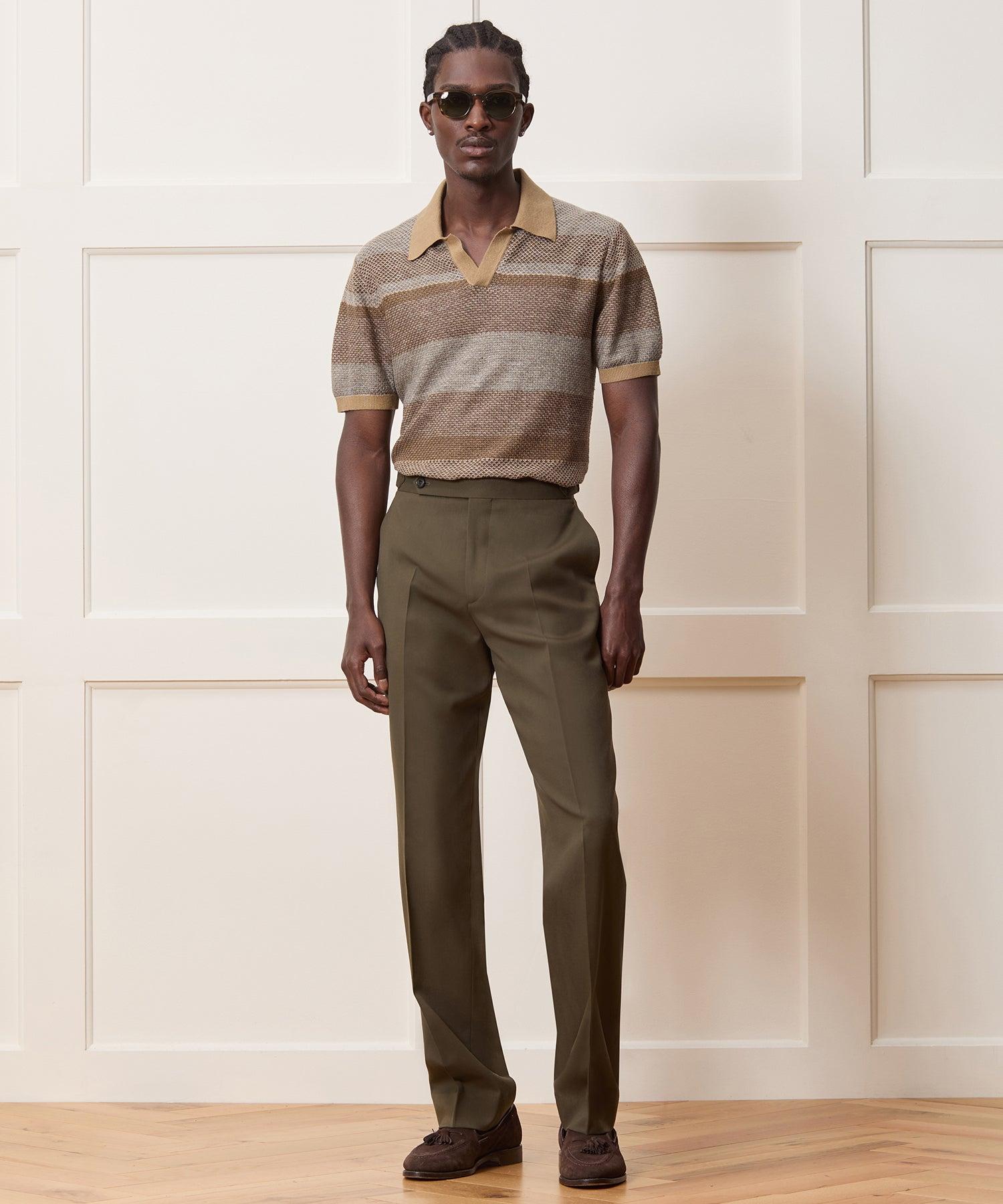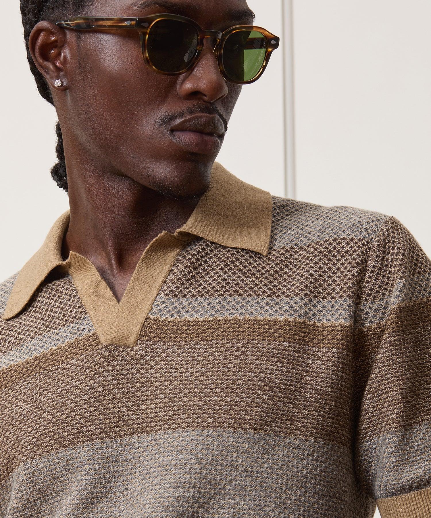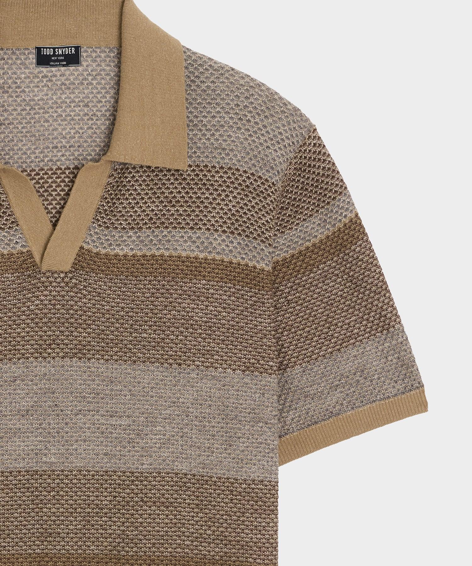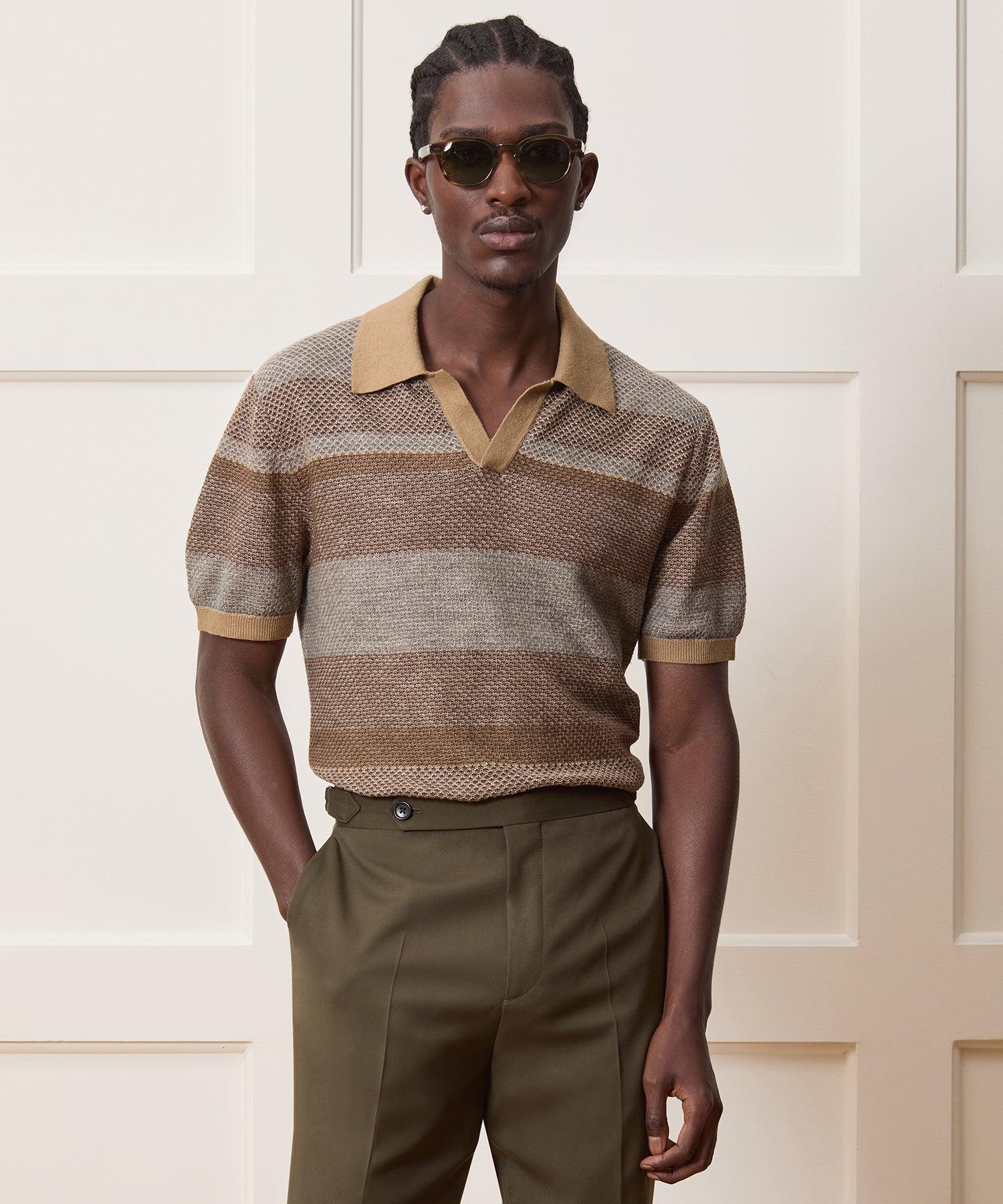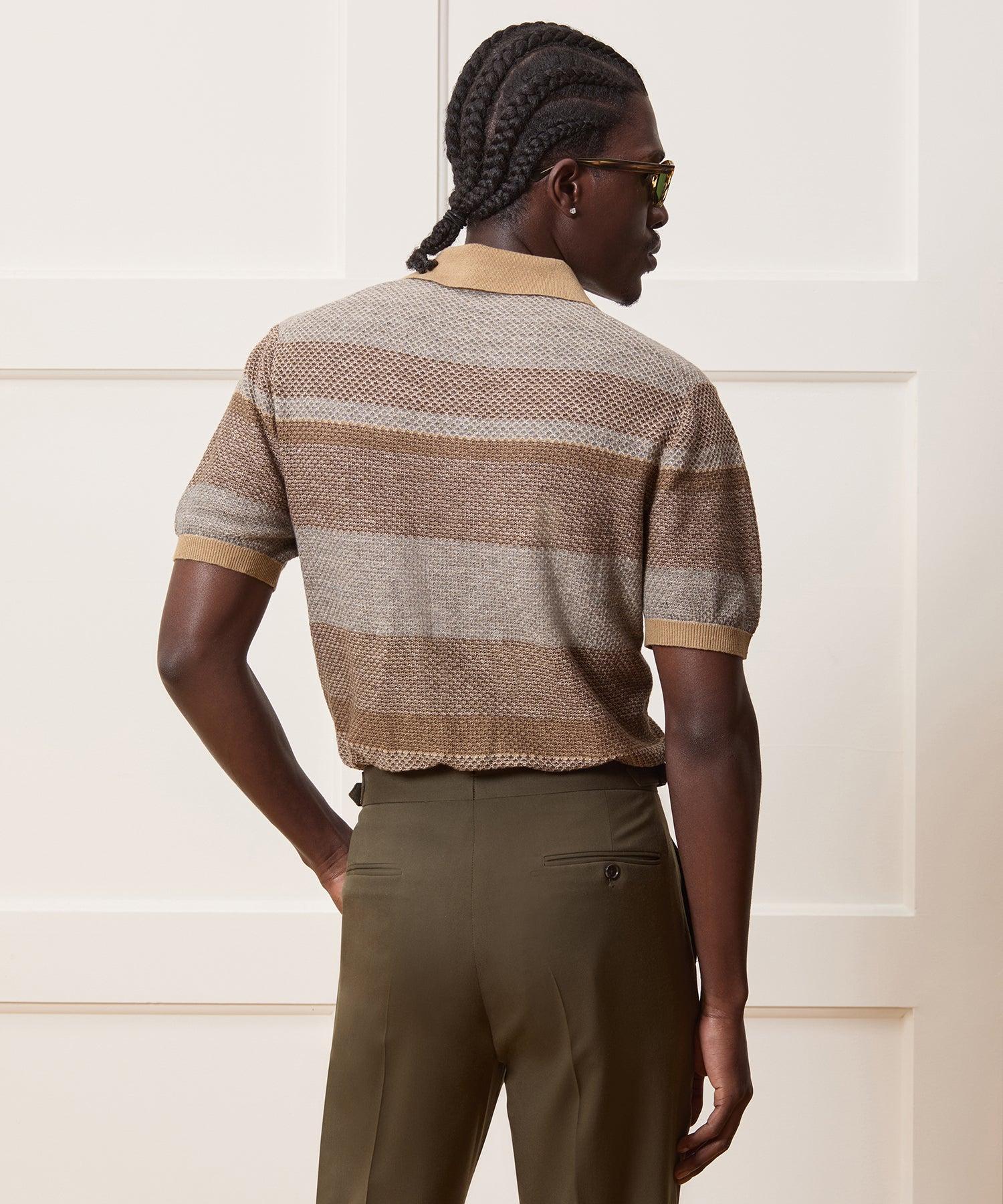 Our bestselling Montauk Polo, in a soft linen-cotton yarn that’s just the right weight to see you from now through to fall. It’s knit in a textured stripe, and the yarn is plaited, giving the colors — shades of khaki, gray and light blue — a softly muted effect. With an easy, slim fit and our signature Montauk collar (a buttonless style that’s often referred to as a “Johnny” collar), it’s perfect to wear on its own, or to add a pop of texture beneath a jacket or sport coat. 65% Linen, 35% Cotton Slim Fit Model is 6'2" and is wearing a size Medium Johnny Collar Garment Made in China Machine Wash Cold With Like Colors. Delicate Cycle. Do Not Bleach. Do Not Tumble Dry. Lay Flat To Dry. Cool Iron If Needed. Dry Clean. Style SW6979200