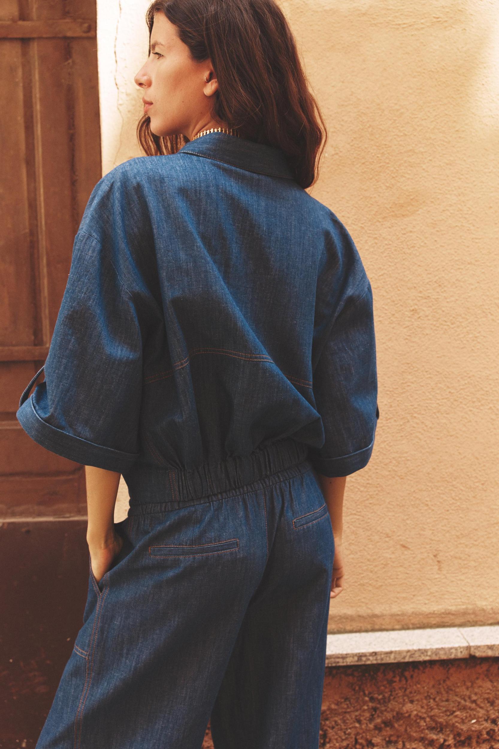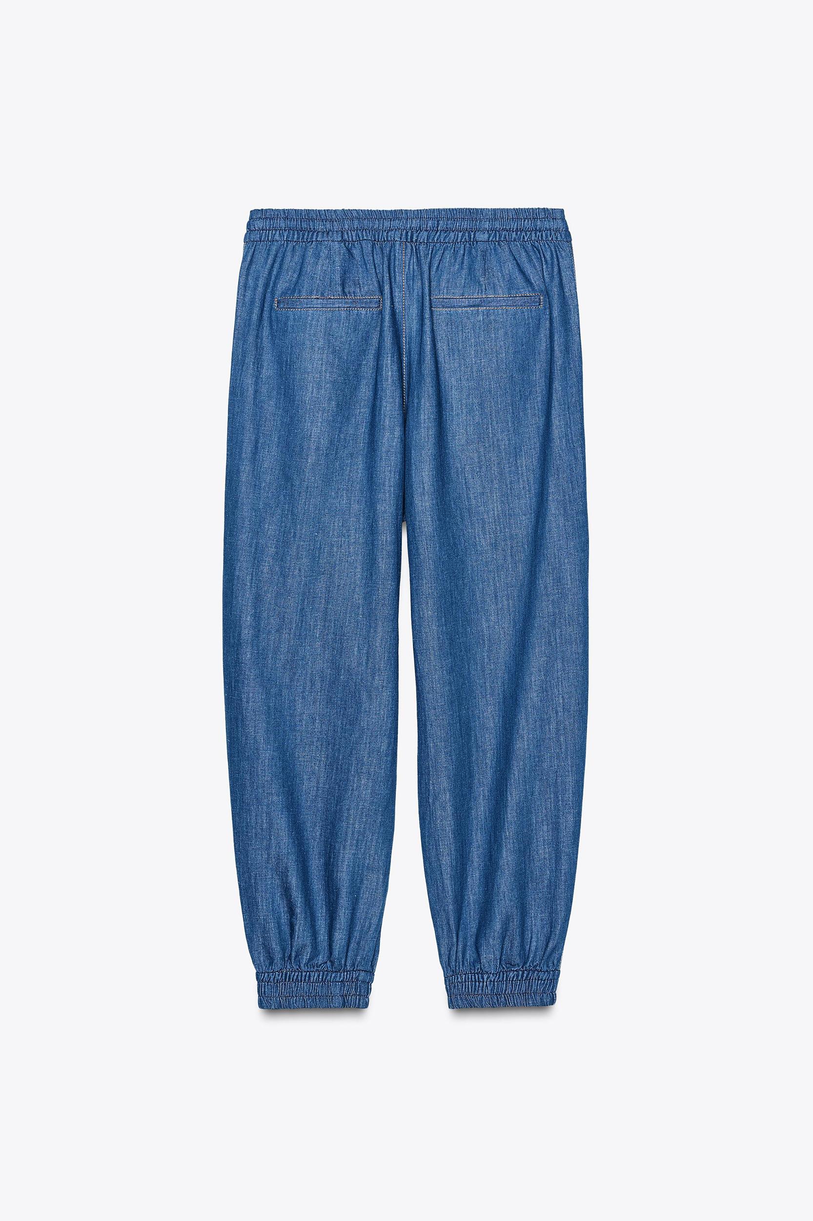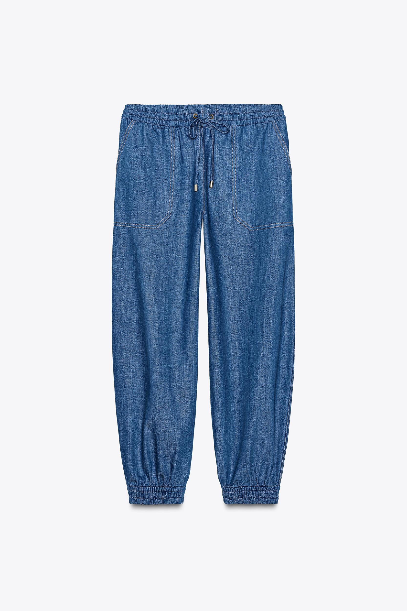 Pants made with linen. High-waisted with adjustable elastic drawstring waistband. Front pockets and false welt pockets in the back. Elasticated cuffs.