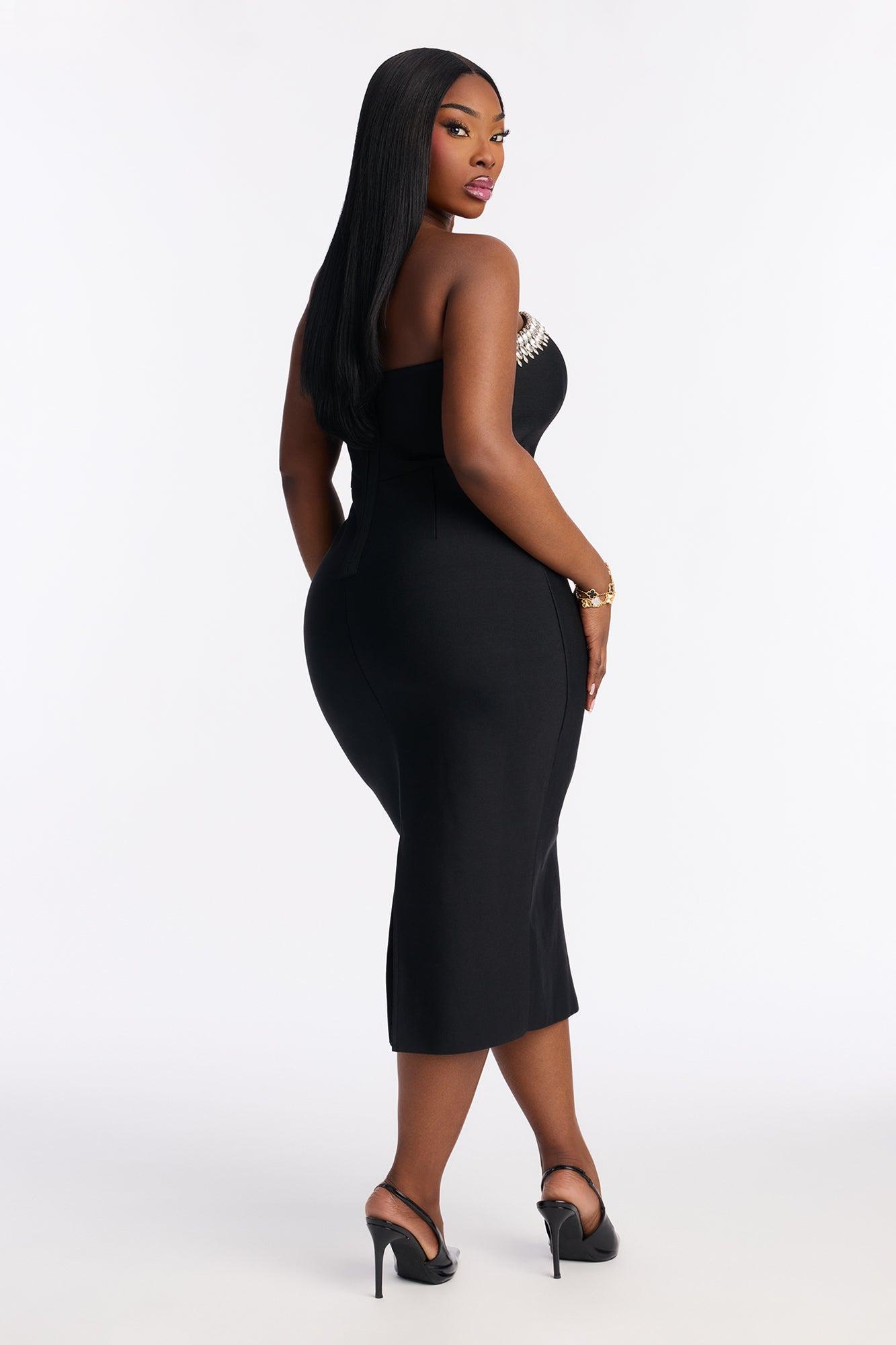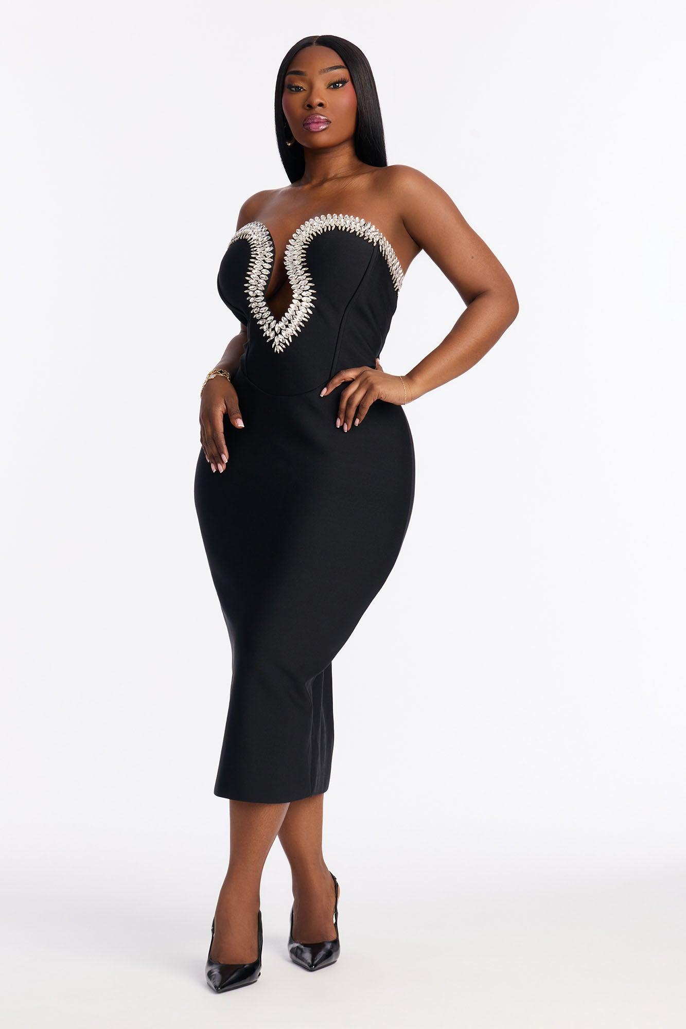 Available In Black And Hunter. Bandage Midi Dress Sweetheart Neckline Strapless Rhinestone Trim Neckline Backless Zipper Stretch Length Measured Flat = 39" Self : 90% Polyester 10% Spandex Lining : 95% polyester 5% Spandex Imported California Proposition 65WARNING: Cancer and Reproductive Harm - www.P65Warnings.ca.gov.