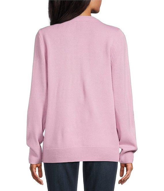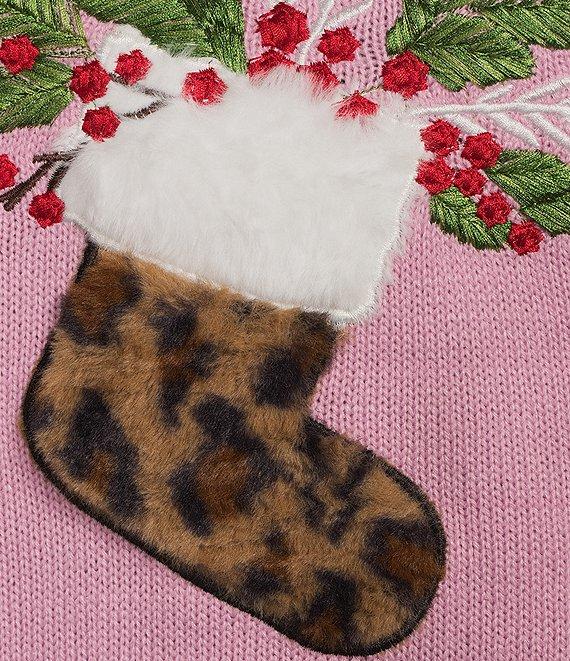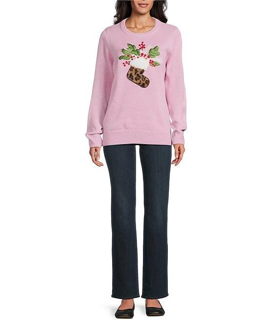 From Lisa International, this sweater features: Sweater knit fabrication Crew neckline Long sleeves with cuffs Embellished leopard stocking Loose fit Straight ribbed hemline Pullover construction Acrylic; exclusive of decoration Hand wash Imported.