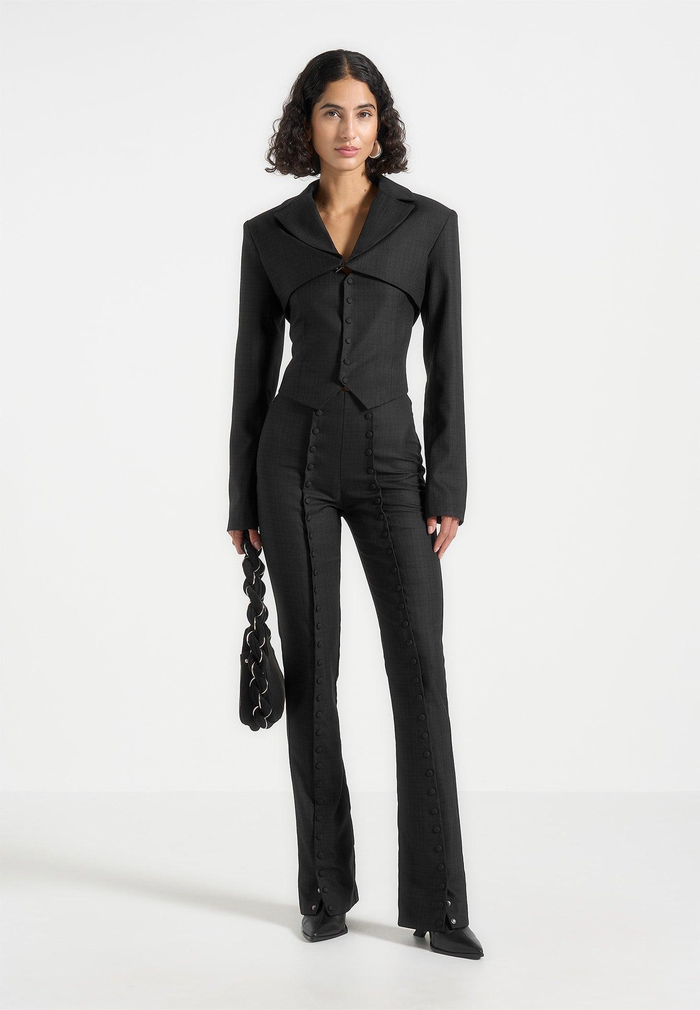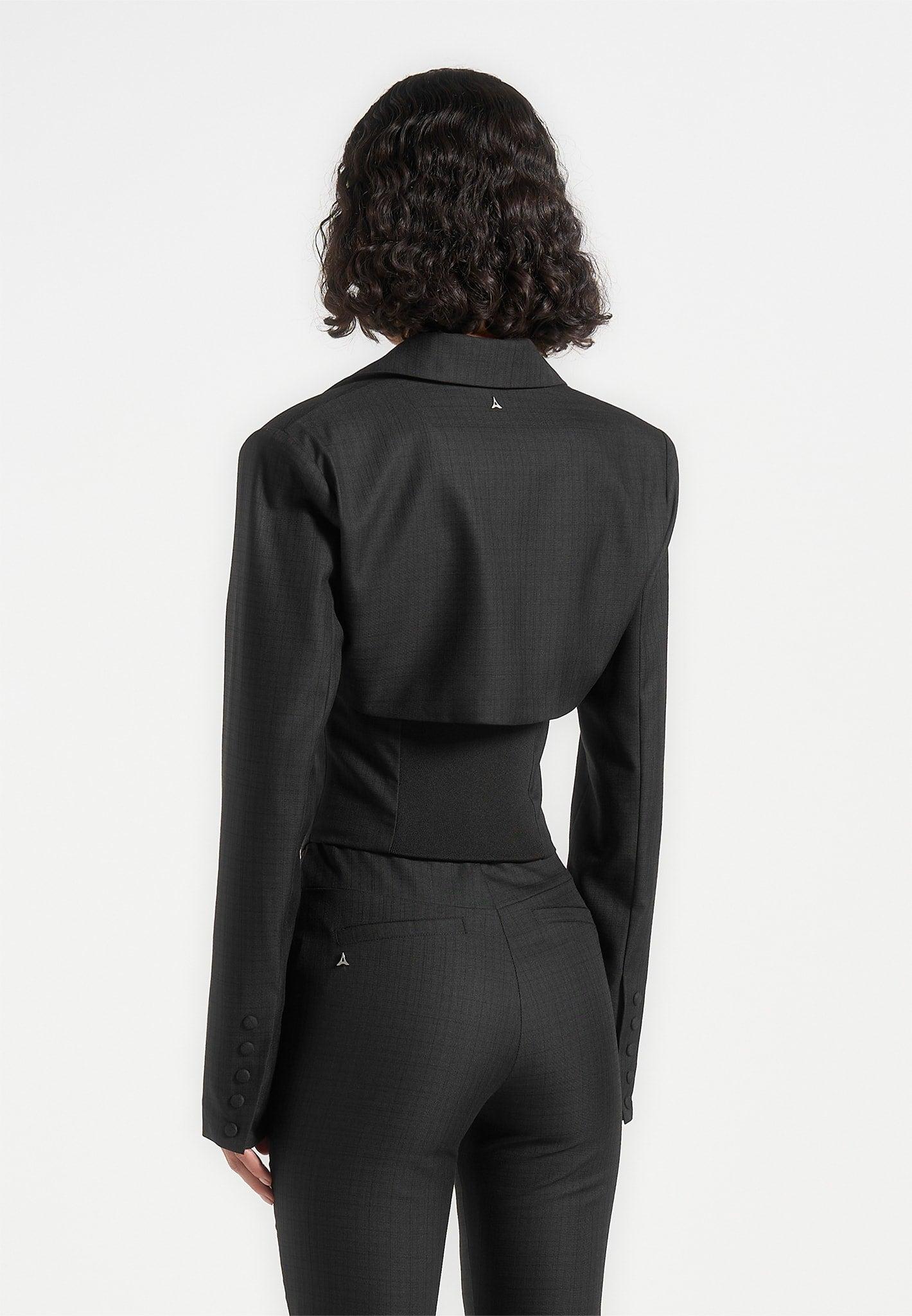 This two-piece set delivers a bold, architectural approach to tailoring. Featuring a structured bandeau top with a sculpted fit and a sharply cropped blazer overlay, the design fuses feminine form with classic menswear details. The blazer layer includes a wide lapel, tailored shoulders, and extended sleeves with buttoned cuffs, creating contrast against the fitted, button-down bandeau beneath. Designed in clean high-quality suiting fabric, it’s a modern power pairing perfect for day-to-night styling. Two-piece set: structured bandeau top and cropped blazer overlay Bandeau features contour seams, button front, and pointed hem Cropped blazer with notched lapel and long tailored sleeves Sharp shoulders and minimal branding for a clean finish Constructed from high-quality tailoring fabric for a luxurious finish Silver Manière De Voir plaque on the reverse serves as a signature accent 75% Polyester, 25% Rayon / 96% Polyester, 4% ElastaneAlways check the care label for wash instructions.
