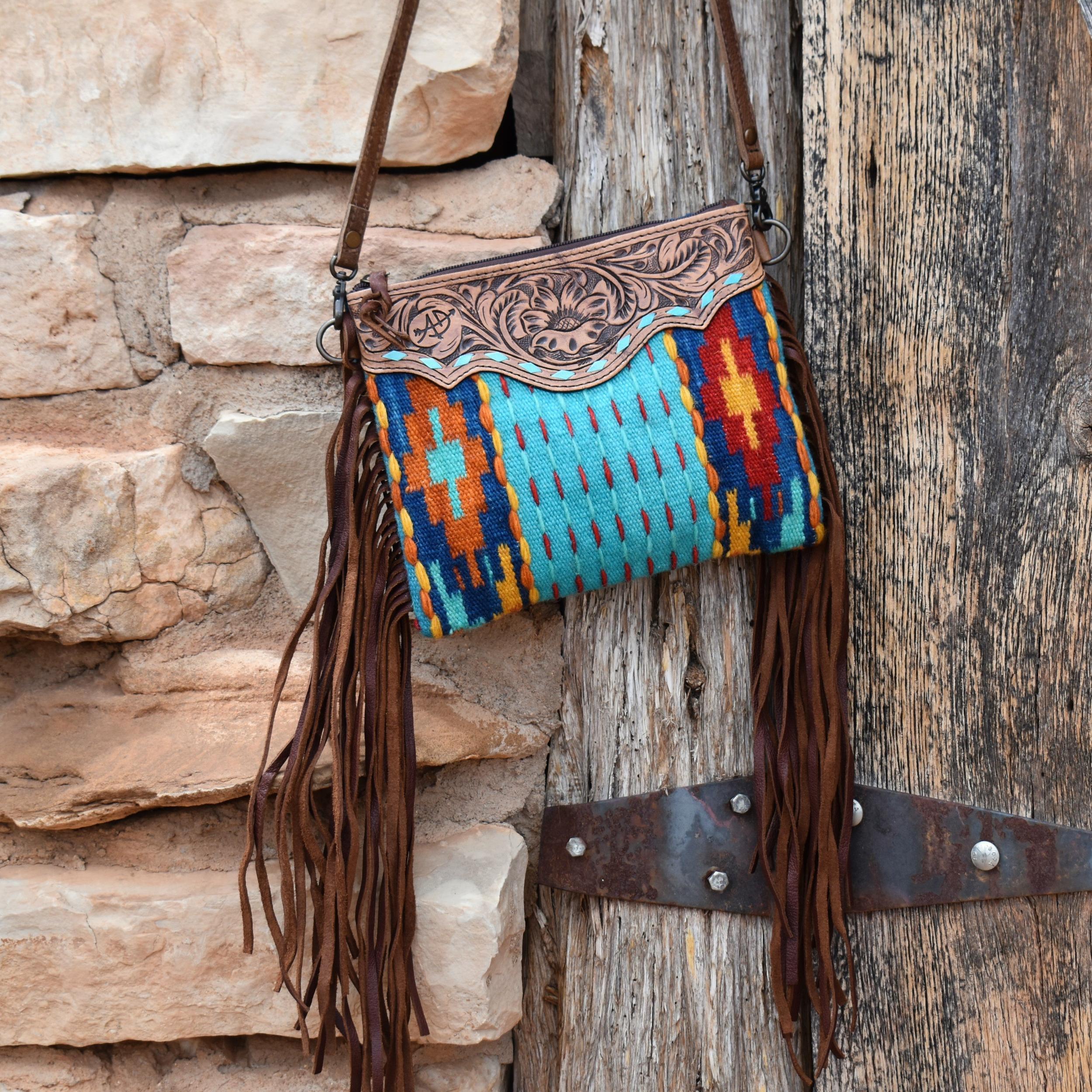 Beautiful and unique saddle blanket cross-body featuring brown leather fringe on the sides. Tooled leather front at the top showcasing a stunning sunflower motif. Bag is zipper closure, with small inside zipper pocket, small open pocket. Cross-body is strap is adjustable and removable. 10"H X 8"W X 1"D Strap-51"