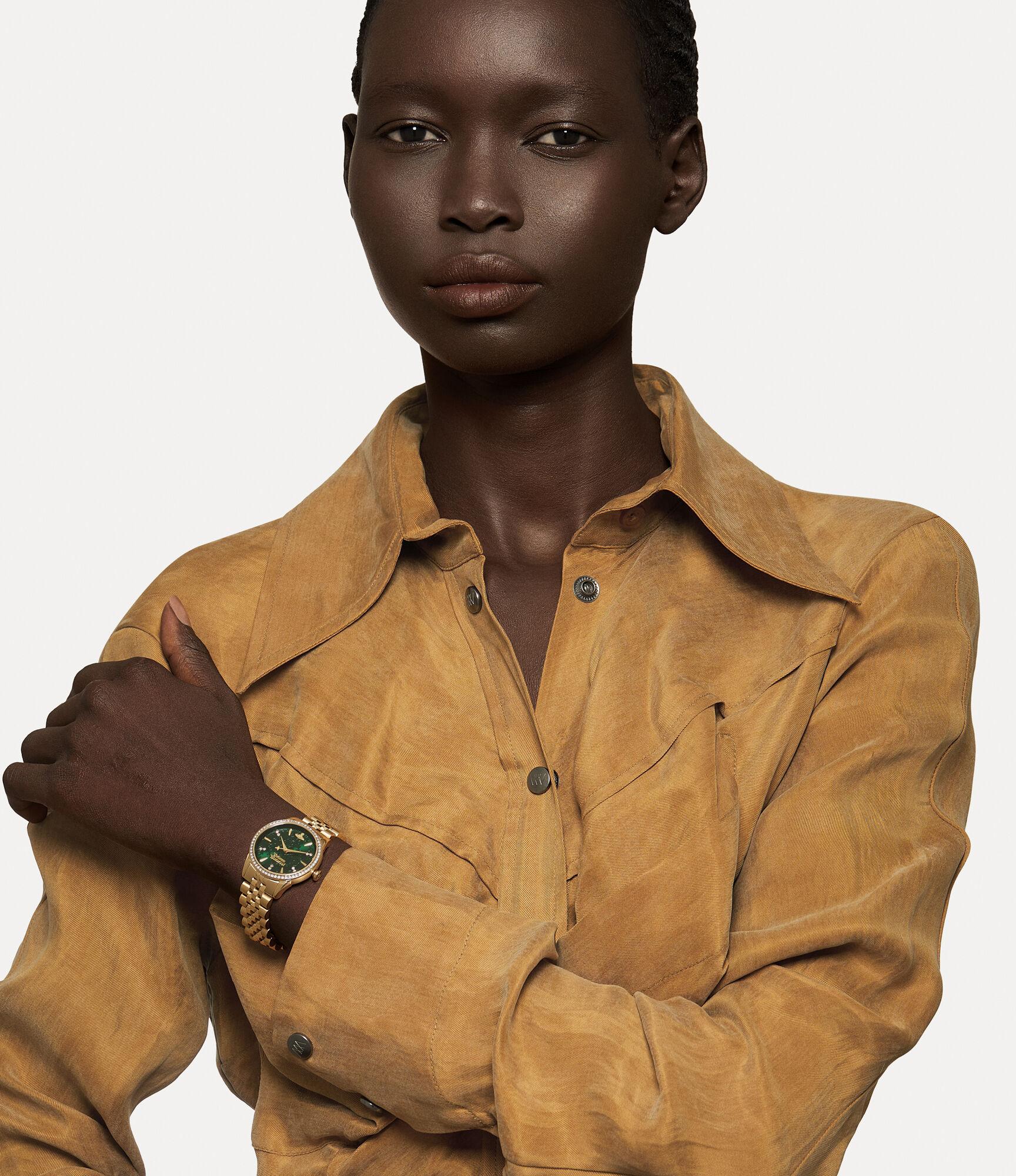 The Little Wallace watch is named after the infamous Wallace Collection in London, recalling Vivienne's admiration for art. The piece offers a green jacquard-etched dial, inspired by Jean-Honoré Fragonard’s 'The Swing', a masterpiece housed within the collection, complete with a gold-toned metal bracelet and Swarovski crystal details.