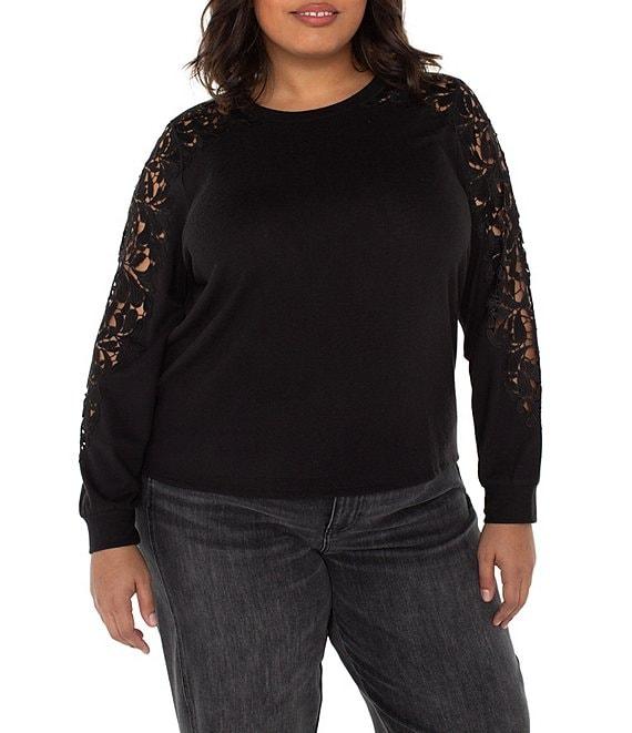 From Liverpool Los Angeles Plus, this top features: Knit fabrication Crew neckline Long sleeves Soft lace inset detailing Straight hemline Pullover construction Approx. 26" length Polyester/elastane Machine wash cold Imported. A refined essential with a romantic touch. This long sleeve knit top features a soft lace inset detailing on the shoulders and a crew neck. Perfect for layering or wearing solo with effortless ease.