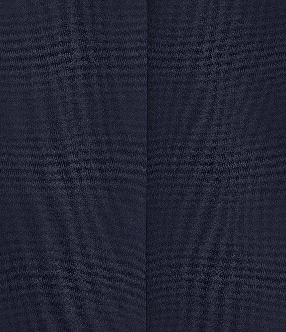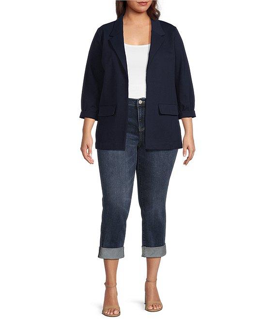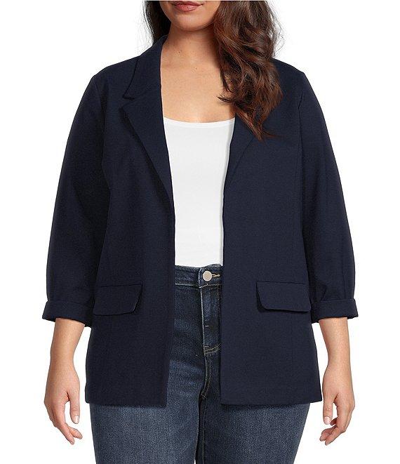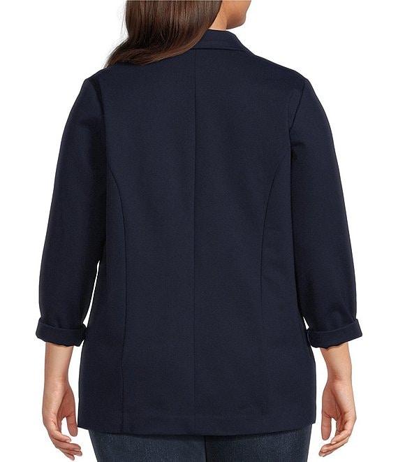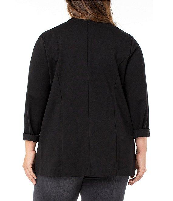 From Liverpool Los Angeles Plus, this blazer features: Stretch ponte fabrication Notch lapel neckline 3/4 sleeves Front flap pockets Straight hemline Open front; no closure Approx. 31" length Rayon/nylon/spandex Machine wash cold inside out/dry flat Imported.