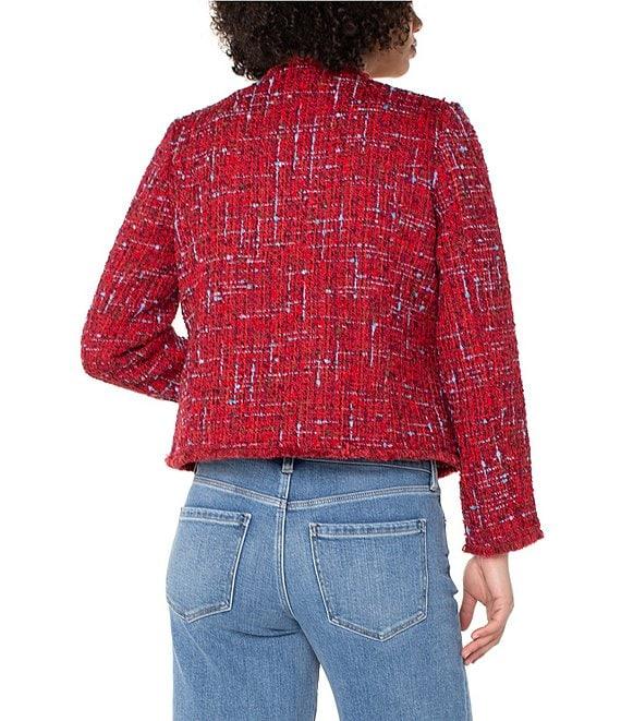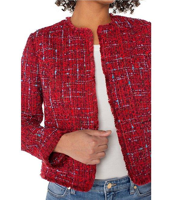 From Liverpool Los Angeles, this jacket features: Boucle fabrication Collarless Long sleeves Frayed edges Side welt pockets Frayed hemline Front hook-and-eye closure Approx. 22.5" length Polyester/wool Machine wash Imported. Exuding elegance and sophistication, our collarless jacket features frayed details adorned with blue accents. This lavish piece adds a touch of luxury to any outfit, making it a must-have for a refined wardrobe