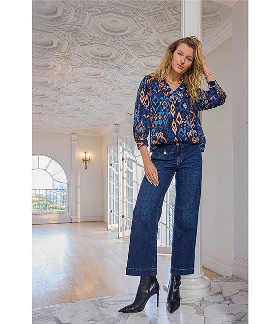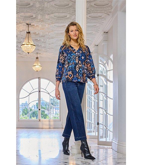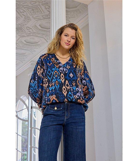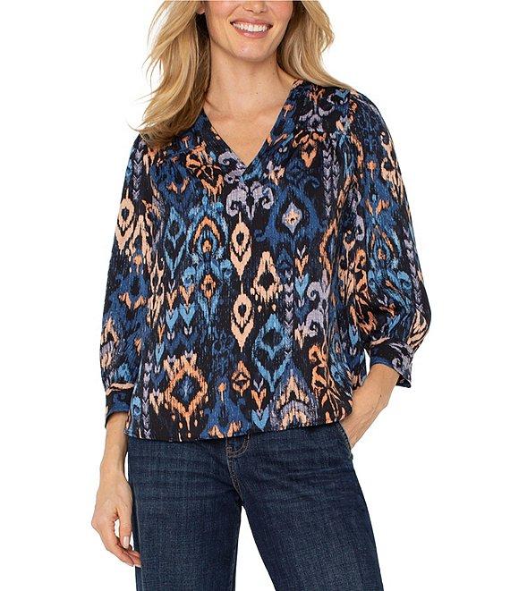 From Liverpool Los Angeles, this blouse features: Woven sateen fabrication Print pattern V-neckline Cuff 3/4 sleeves Light weight Straight hem Pullover construction Approx. 25" length Polyester Machine wash cold/tumble dry low Imported. This airy blouse features a painterly blue multi ikat pattern. 3/4 sleeves and a v-neck add a hint of romance, making it the perfect piece to dress up your denim or bring movement to tailored layers.
